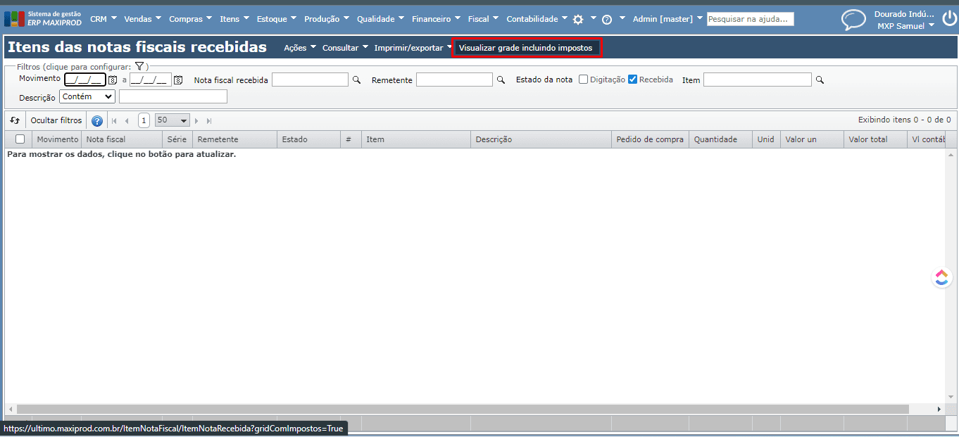 2) Na tela de “Itens das notas fiscais recebidas”, clique na opção “Visualizar grade incluindo os impostos”.