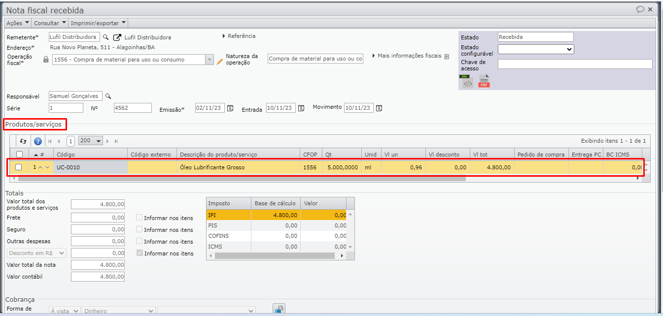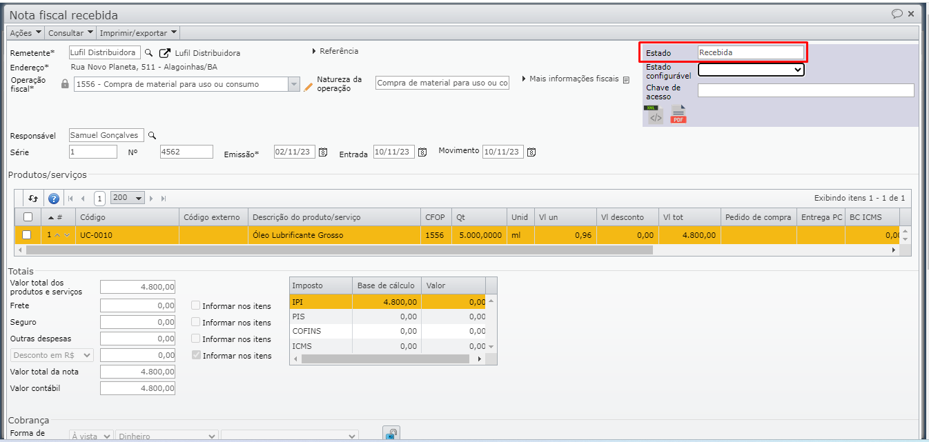 3) Para ser considerada na apuração, a NF recebida deve estar no estado “Recebida”, ou seja, NFs recebidas em estado “Digitação” não são consideradas.