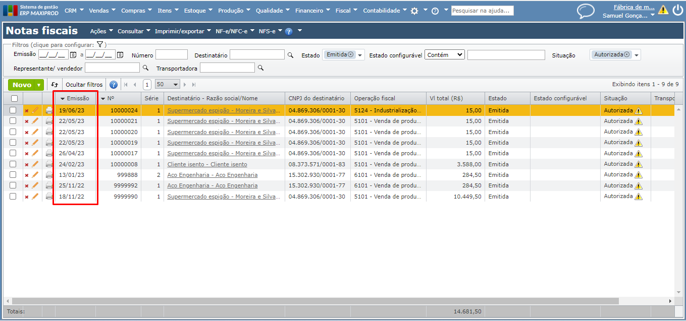 2) Na grade de notas fiscais emitidas (“Vendas > Notas fiscais”), a data de emissão é exibida na coluna “Emissão”.