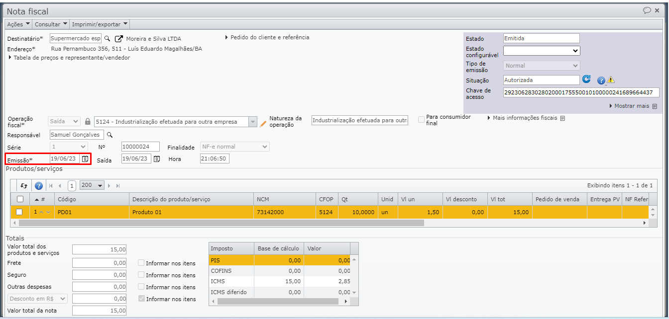 a) Na tela de edição da NF emitida, verifique o campo “Emissão”.