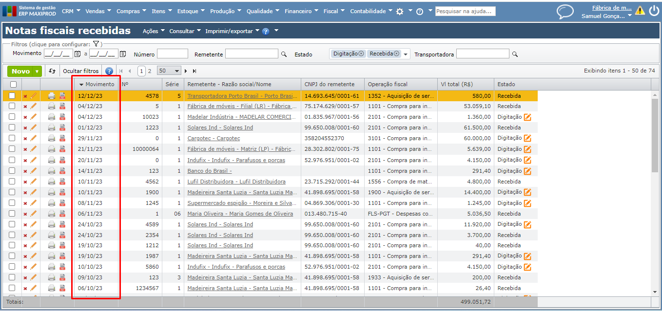 3) Na grade de NFs recebidas (“Compras > Notas fiscais recebidas”), a data de movimento é exibida na coluna “Movimento”, à esquerda na grade.