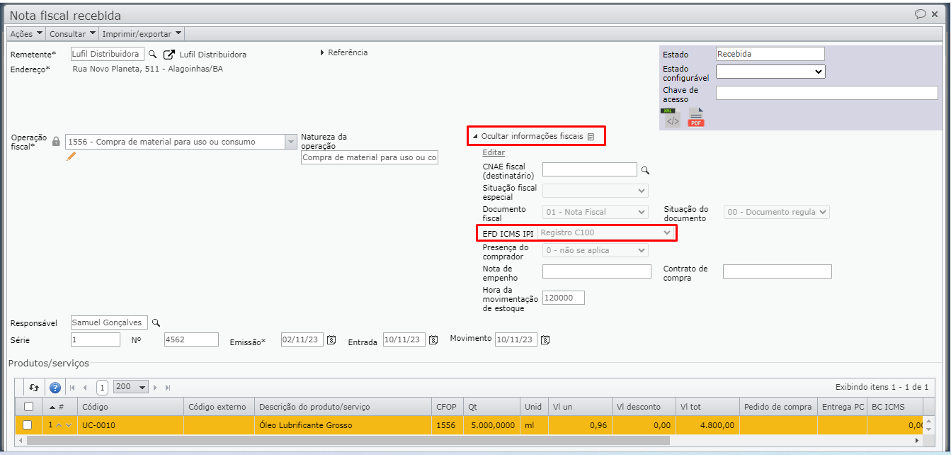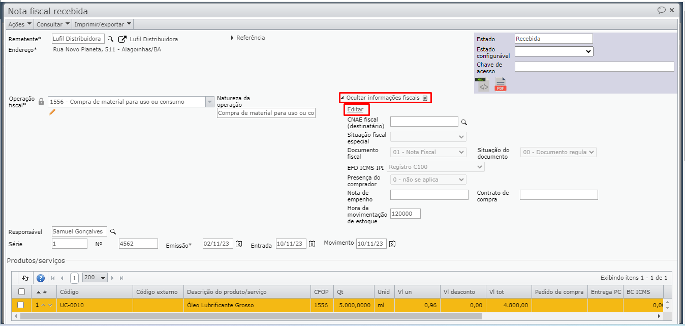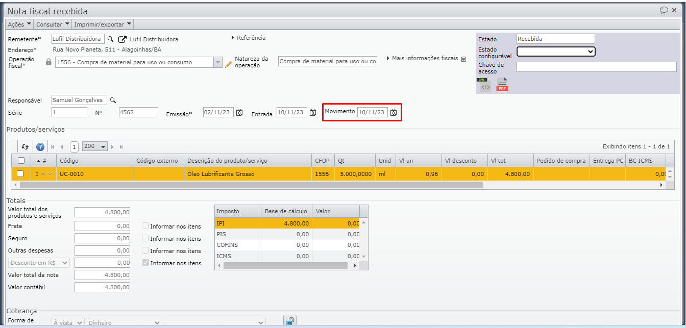 a) Na tela de edição da NF recebida, verifique o campo “Movimento”.