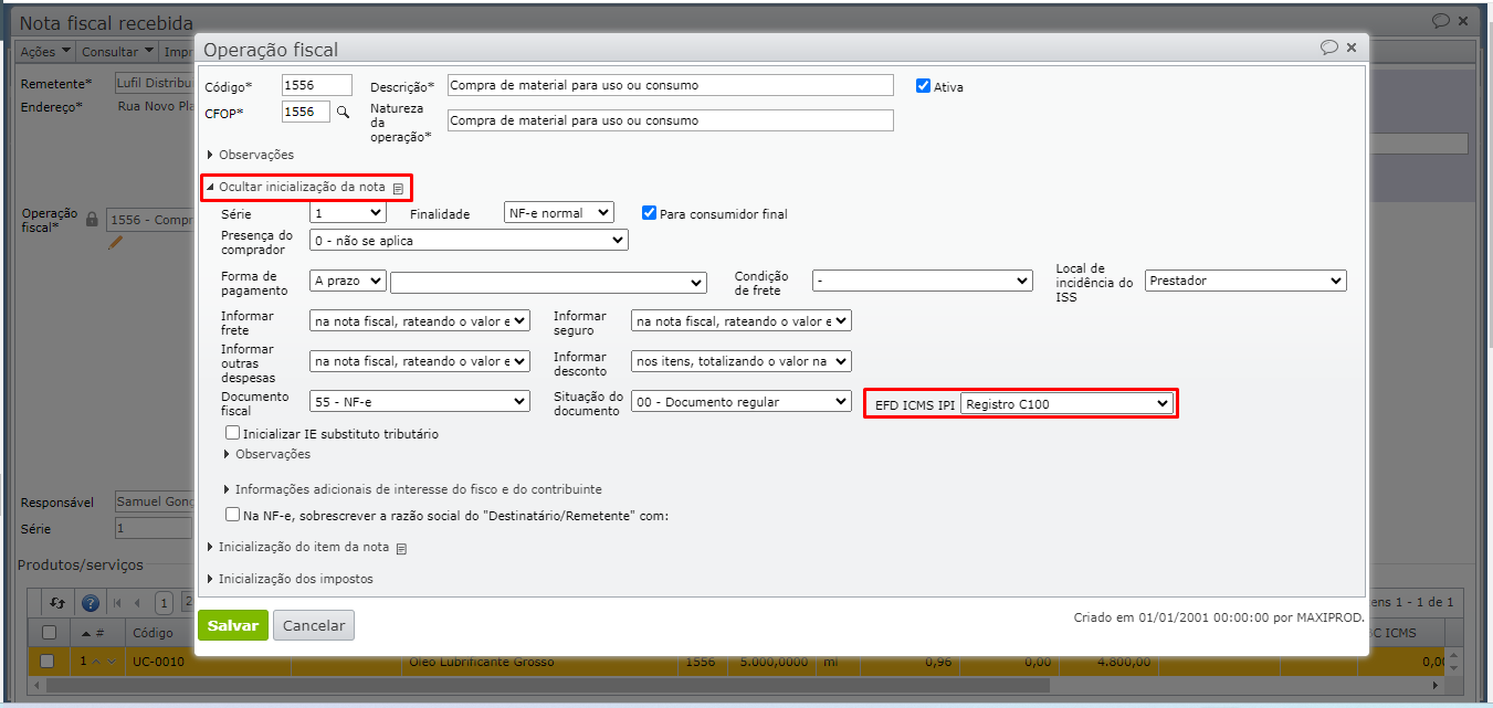 2) O campo “EFD ICMS IPI” é inicializado na NF conforme a configuração da operação fiscal. Para vê-la, acesse a tela de edição da operação fiscal, clicando no ícone do lápis ao lado do campo “Operação fiscal”, expanda a seção “Inicialização da nota” e verifique o preenchimento do campo “EFD ICMS IPI”.