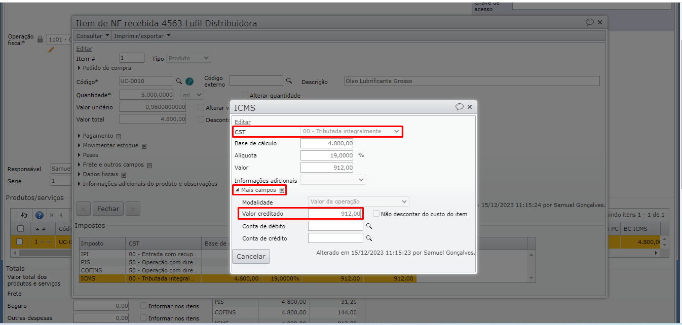 3) Verifique o CST, a base de cálculo, alíquota e valor. A seção “Mais campos” mostra o valor debitado ou creditado do imposto.