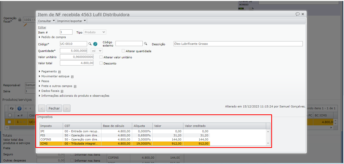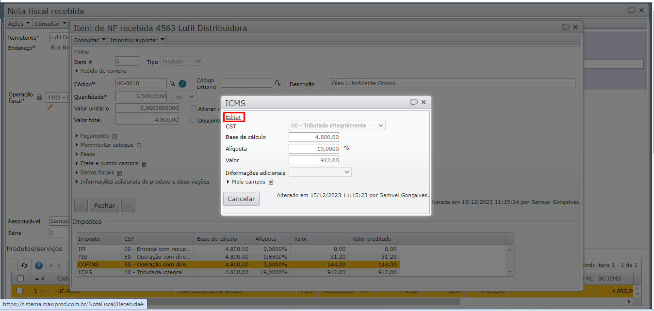 4) Mesmo com a NF em estado “Emitida” ou “Recebida”, pode-se alterar o CST e demais campos, como modalidade, natureza da base de cálculo, código de enquadramento legal ou tipo de crédito, conforme o imposto sendo editado, através do botão “Editar” da janela de edição do imposto. Para saber mais, clique aqui.
