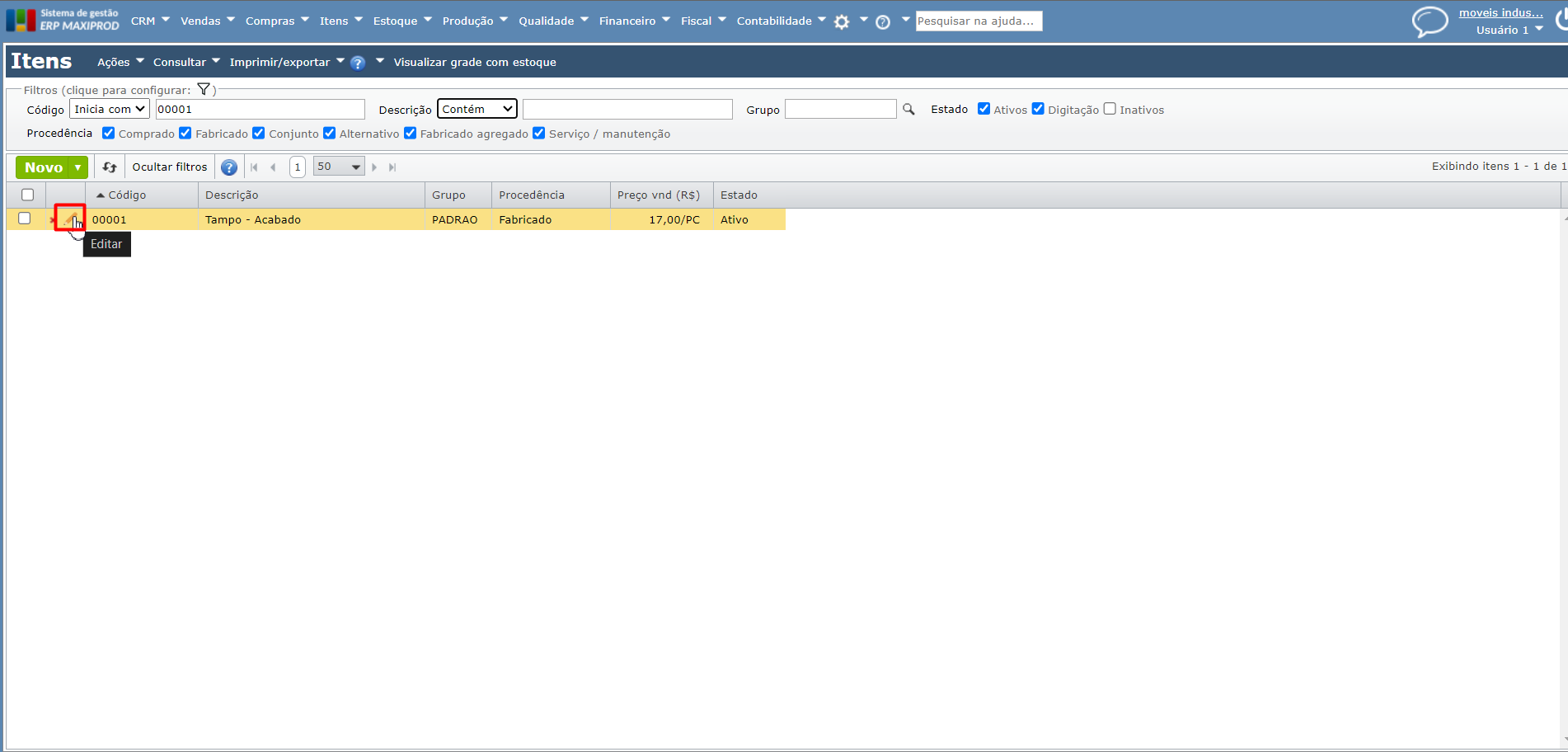 2) Em seguida, identifique o item que deseja alterar e clique no ícone “lápis laranja” para abrir sua edição.