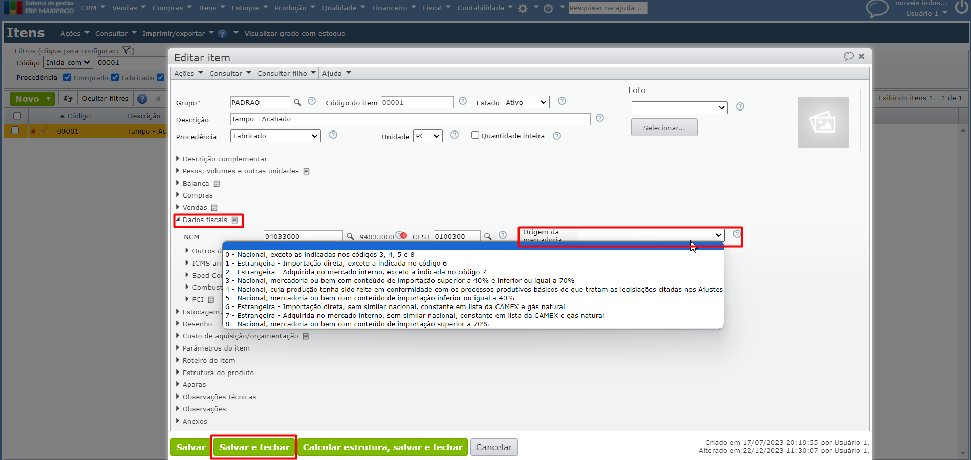 3) Clique na aba “Dados fiscais“, informe a “Origem da mercadoria” e clique no botão verde “Salvar e fechar“.