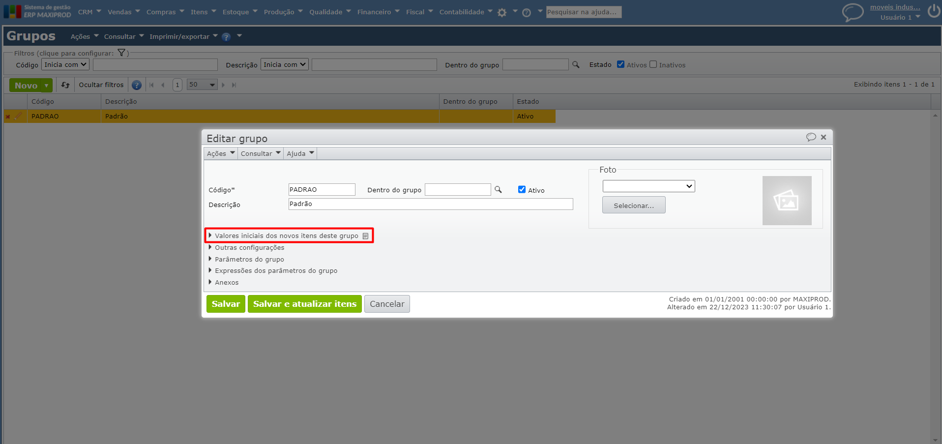 3) Clique na seção “Valores iniciais dos novos itens deste grupo“.