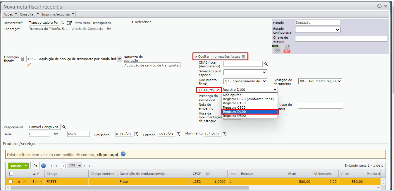 O registro D100 da EFD-ICMS/IPI (Sped Fiscal), deve ser apresentado por todos os contribuintes adquirentes ou prestadores dos serviços que utilizem algum dos seguintes documentos: