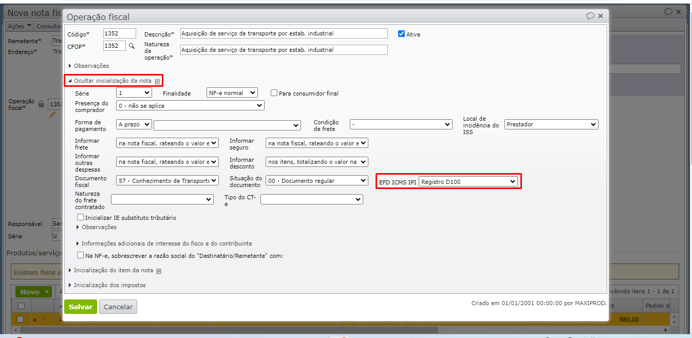 1) No ERP MAXIPROD, a edição do documento fiscal (NF, etc) permite definir o registro da apuração desse documento na EFD-ICMS/IPI (Sped Fiscal). Para isso, expanda a seção “Mais informações fiscais” e veja o preenchimento do campo “EFD ICMS IPI”.