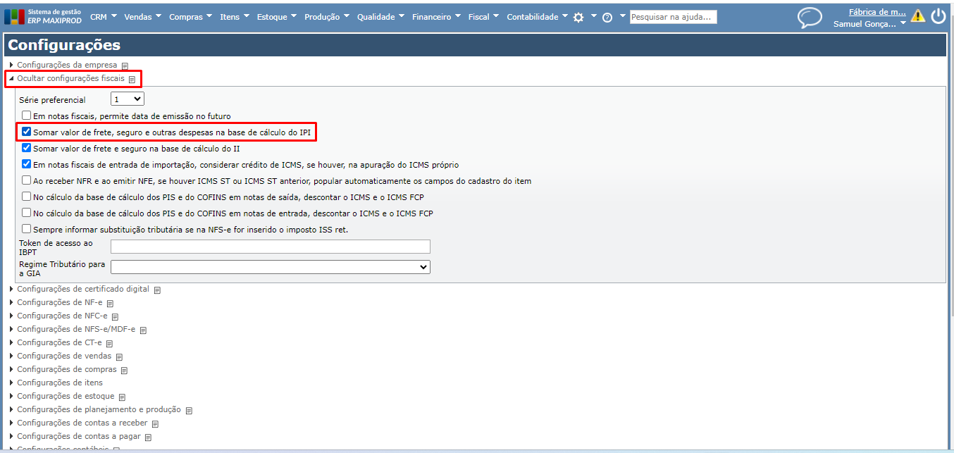 2) Marque a caixa de seleção da opção “Somar valor de frete, seguro e outras despesas na base de cálculo do IPI”.
