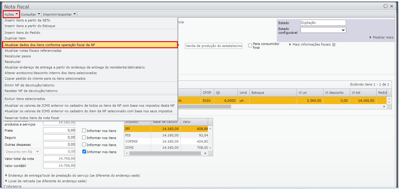 4) Se houver nota fiscal em digitação que deva somar o valor de frete, seguro e outras despesas na base de cálculo do IPI, acesse a edição da nota e utilize o menu “Ações > Atualizar dados dos itens conforme operação fiscal da NF”.