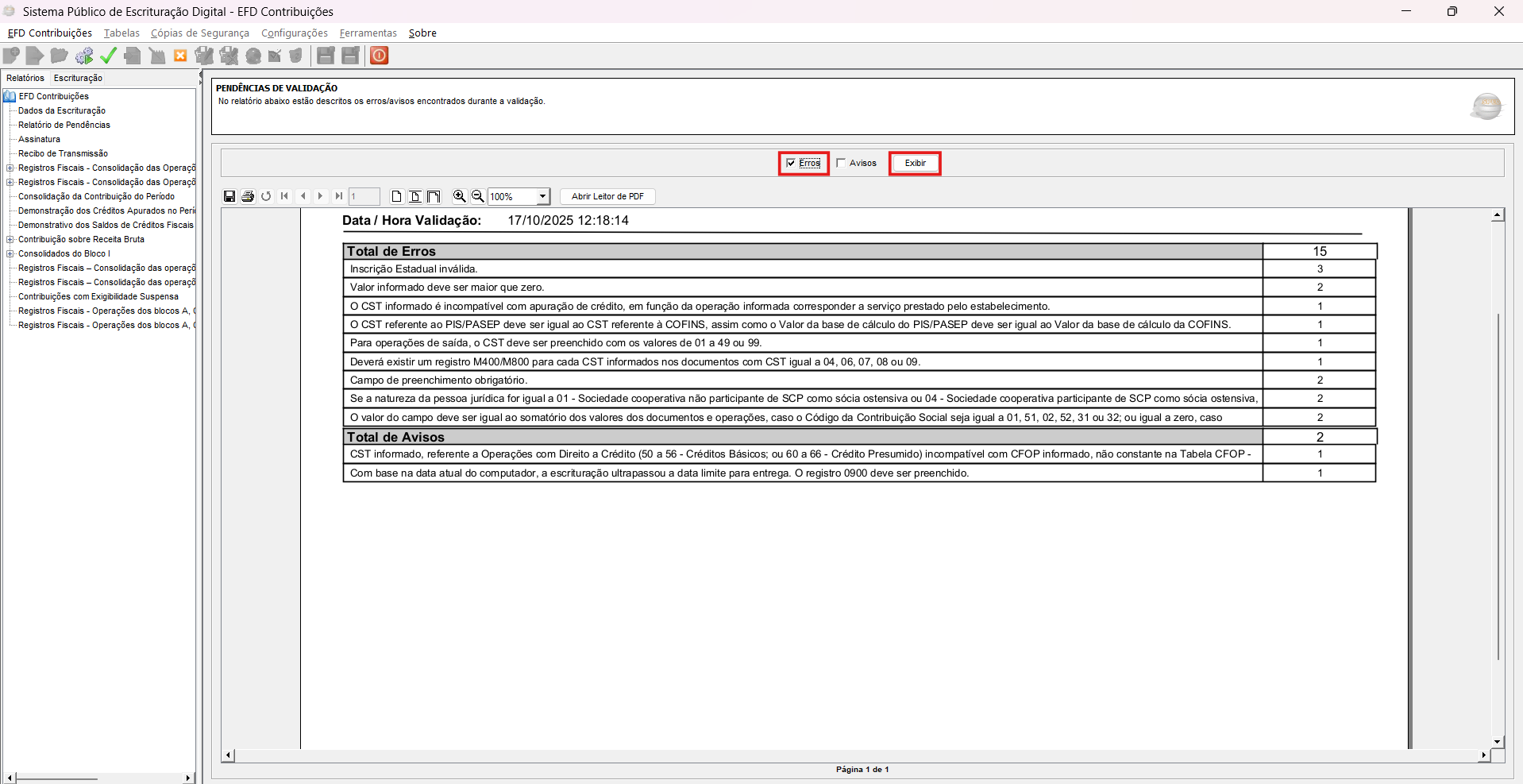 1) Ao abrir o arquivo do SPED Contribuições, clique na caixa de seleção “Erros”, e depois em “Exibir”.