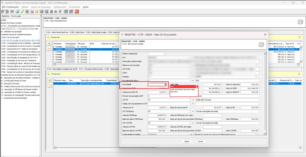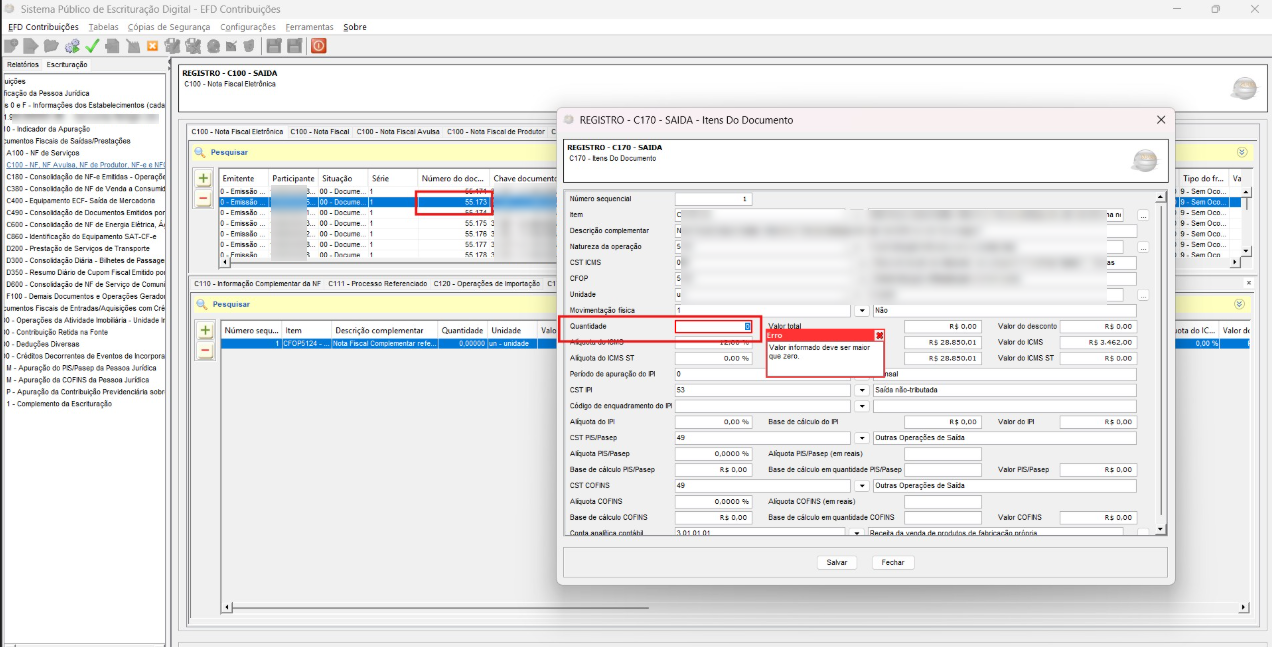 Campos numéricos obrigatórios (como quantidade de itens) estão preenchidos com valor zero ou em branco. No exemplo apresentado, a quantidade do item em uma nota fiscal de complemento de ICMS está com valor 0, o que causou o erro.