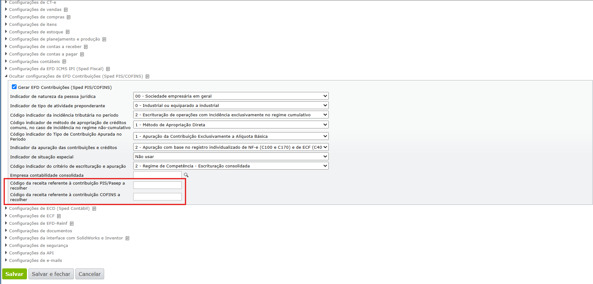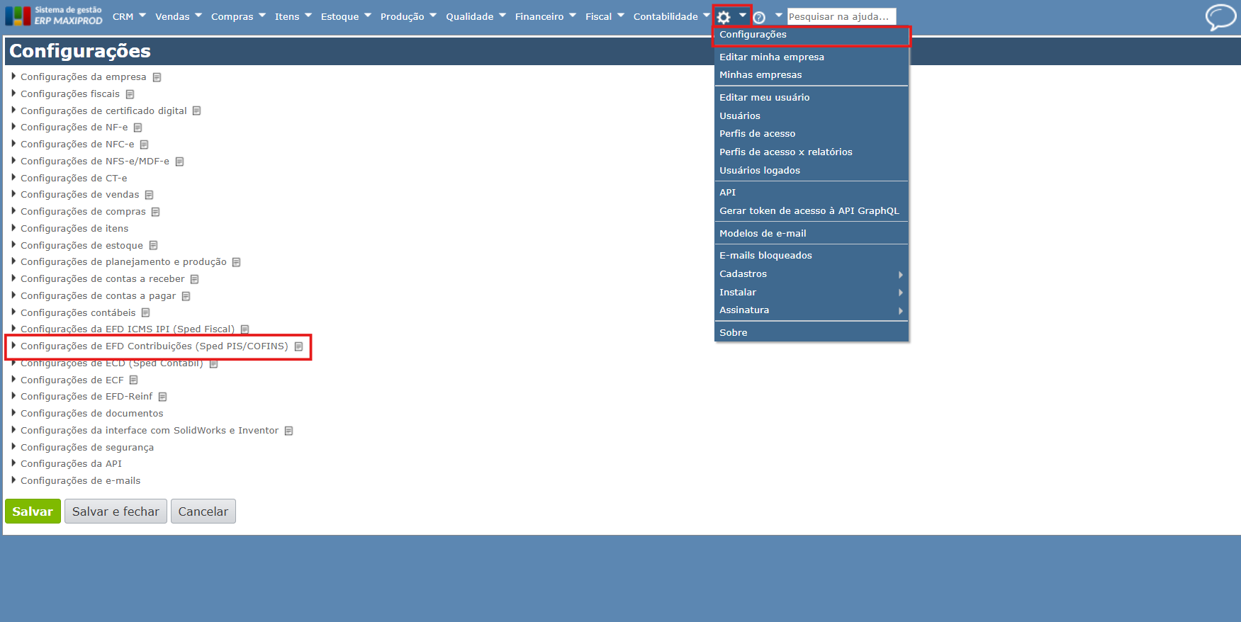 1) Clique no menu “Roda dentada > Configurações”,expanda a seção “Configurações de EFD Contribuições (Sped PIS/COFINS)”.