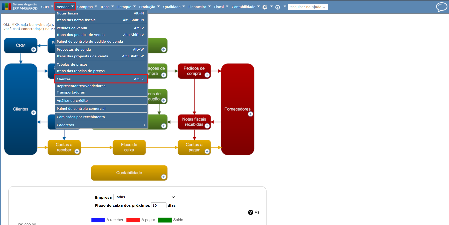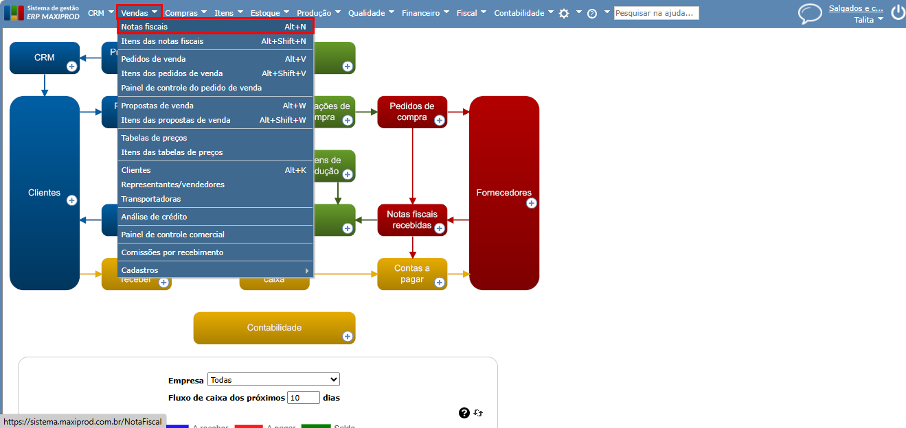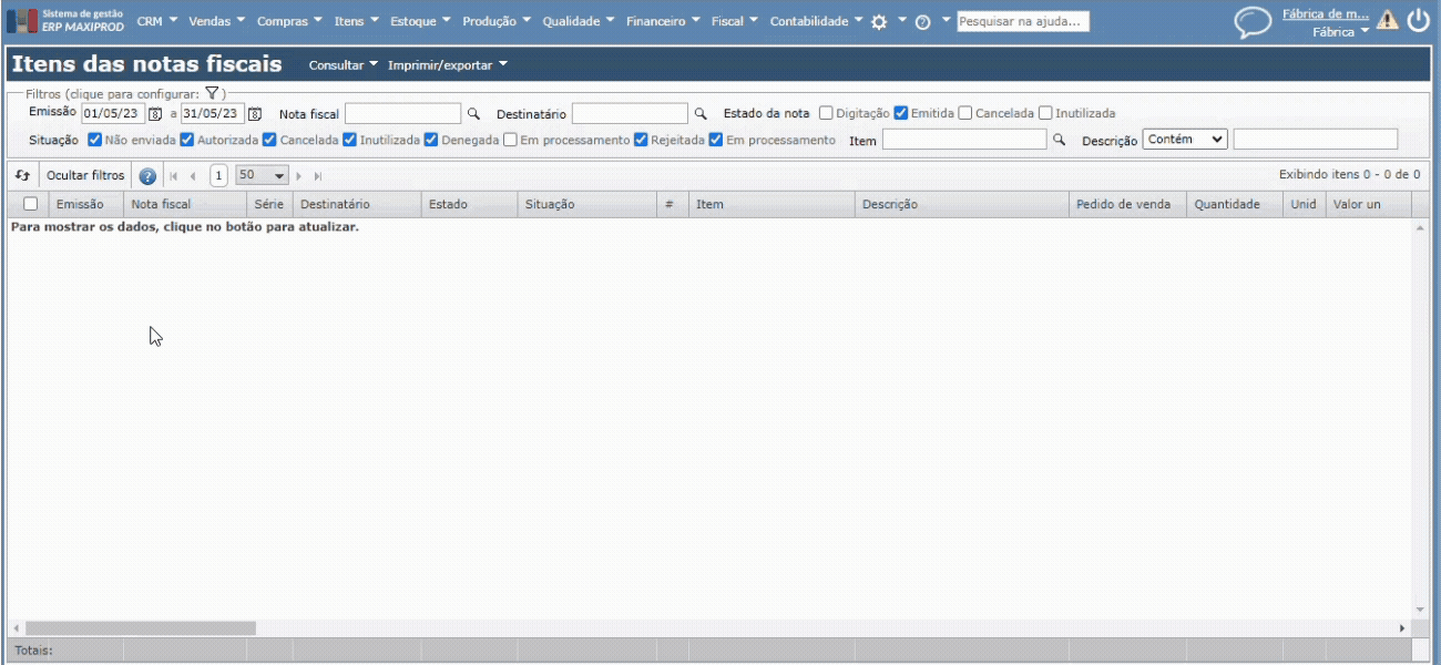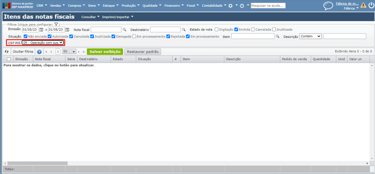 2) A seguir, acesse o ERP Maxiprod e procure nas telas “Itens das notas fiscais” ou “Itens das notas fiscais recebidas” os itens que tiveram este CST para este imposto no período.