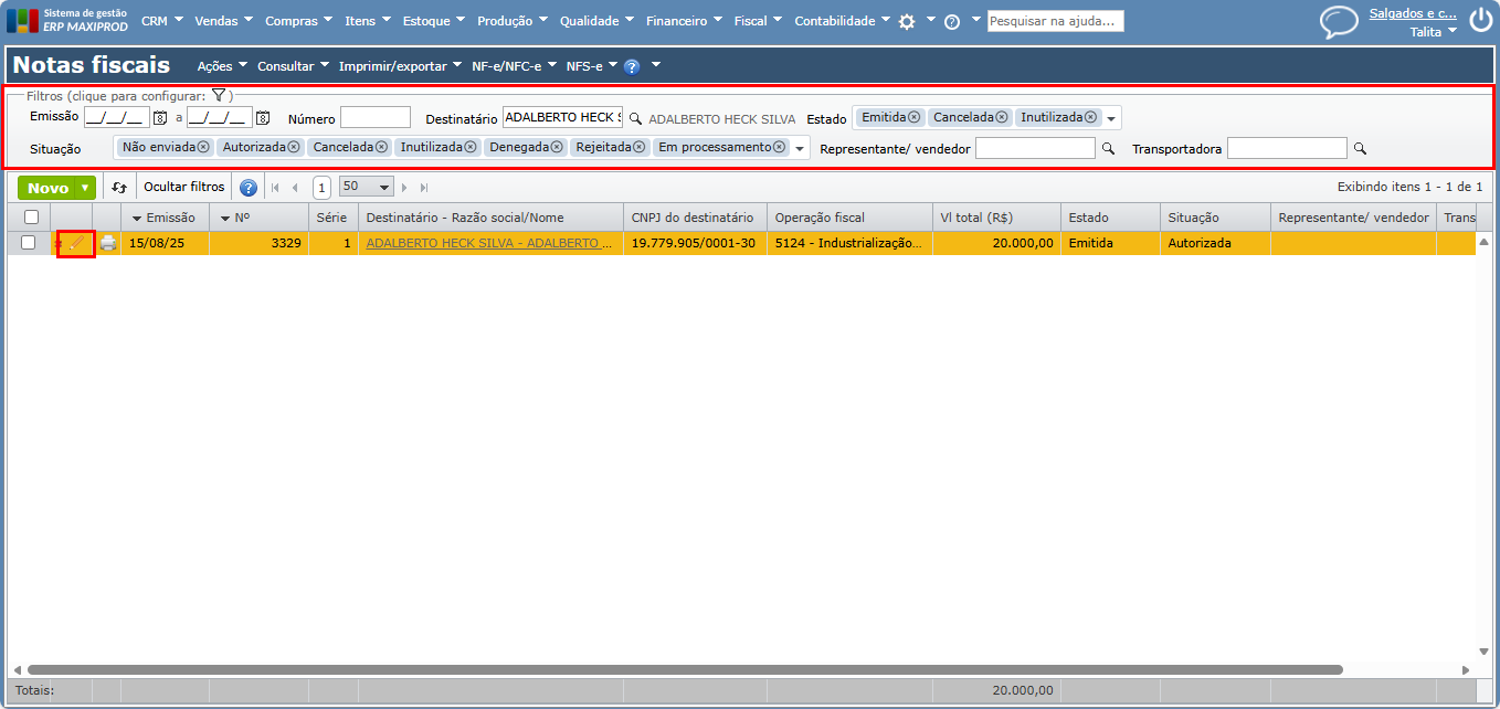 2) Utilize os filtros para localizar a nota fiscal em que o erro foi apontado. Para identificar o número do documento fiscal que originou o erro, clique aqui. Após localizar a NF, clique no ícone de lápis para editar.