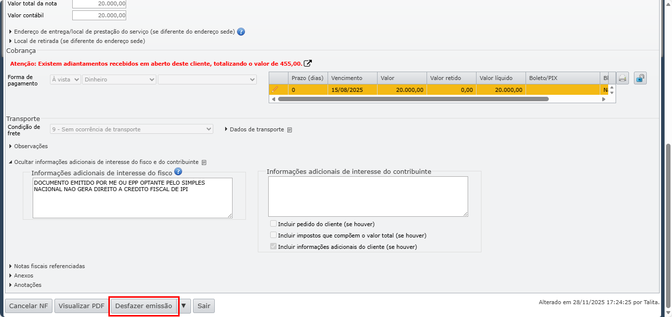 3) Desfaça a emissão da nota, clicando no botão cinza “Desfazer emissão” para que a nota volte para o estado “Digitação”. Esta ação, caso a NF-e esteja autorizada, não afeta o que foi transmitido para a SEFAZ. Para saber mais sobre o assunto, clique aqui.