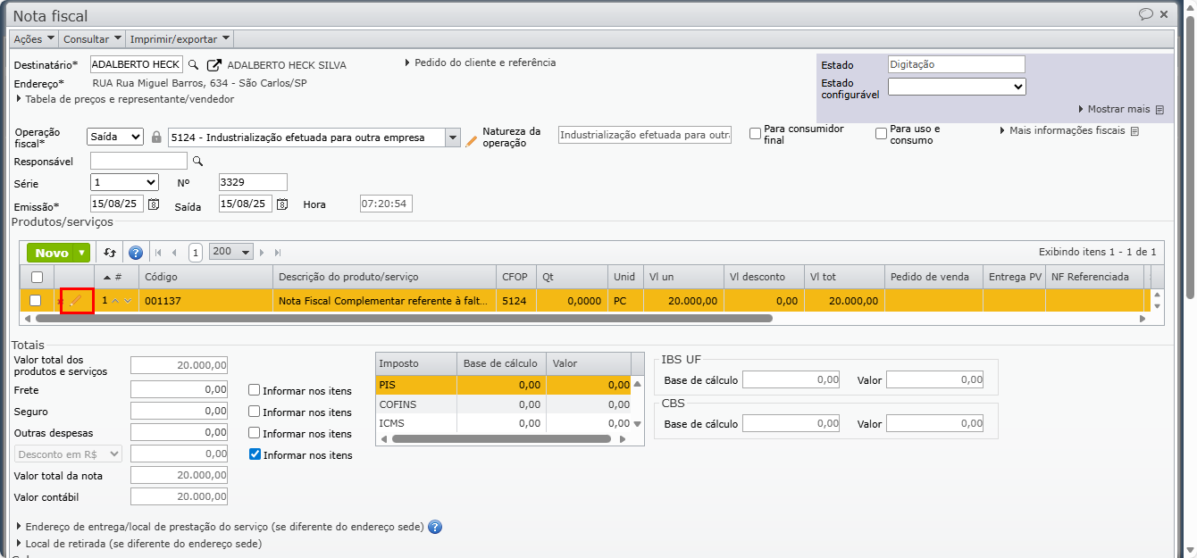 4) Acesse os itens da NF, clicando no ícone de lápis.