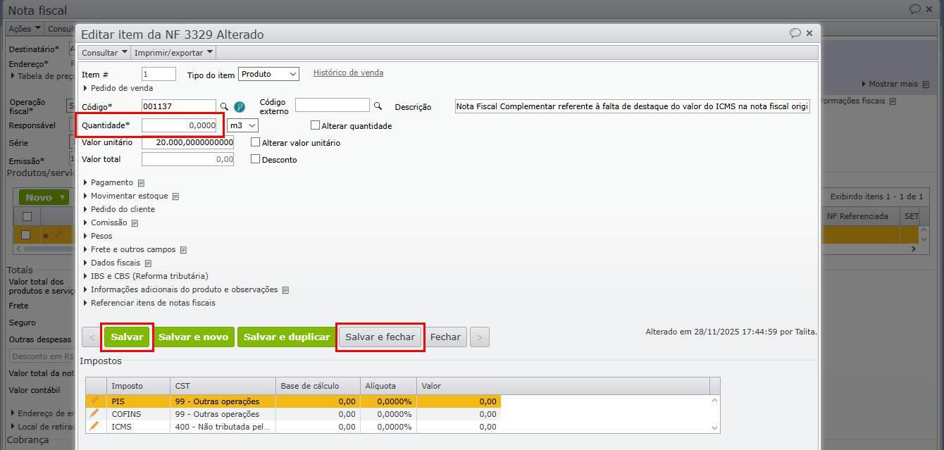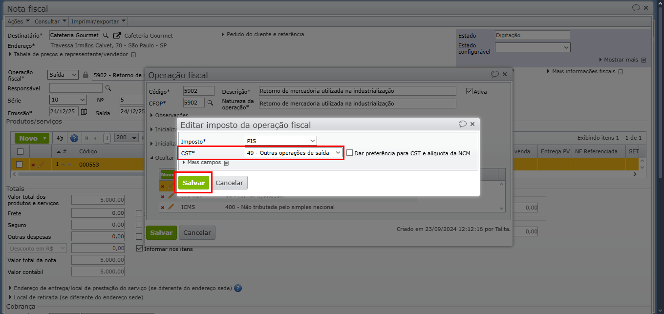 6) Edite o campo “CST” para o valor correto e clique no botão verde “Salvar” para registrar a alteração.