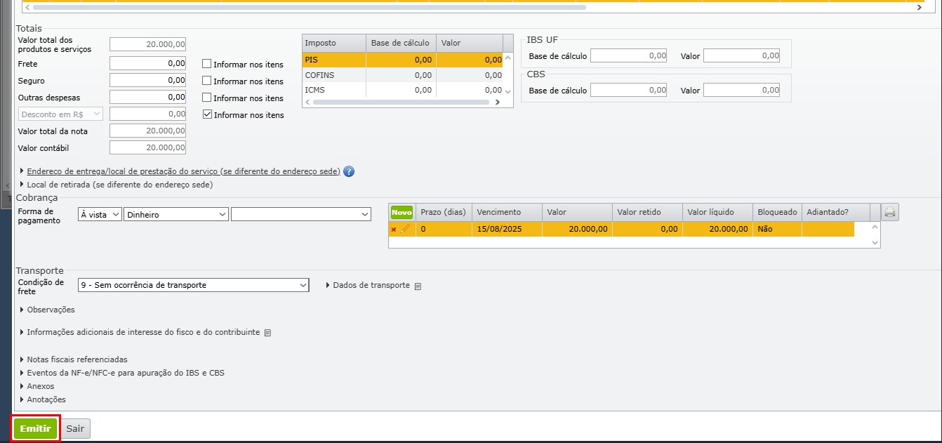 8) Emita a nota fiscal novamente clicando no botão verde “Emitir”.