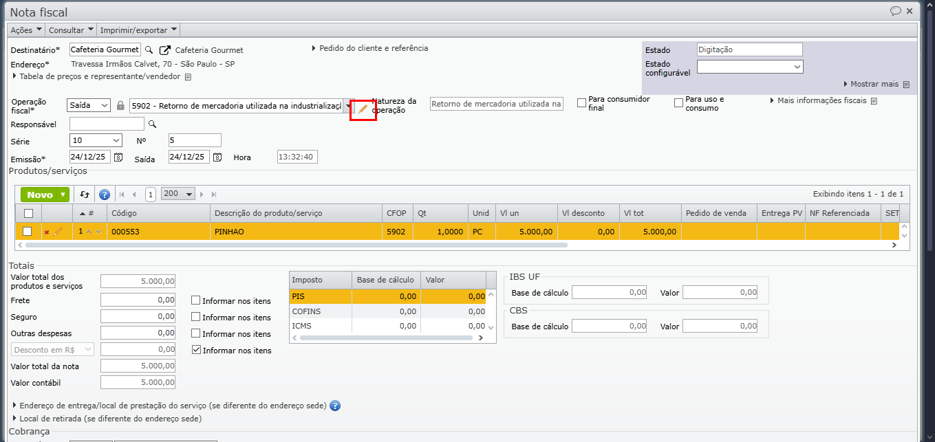 4) Clique no ícone lápis laranja ao lado da operação fiscal da nota para editá-la.