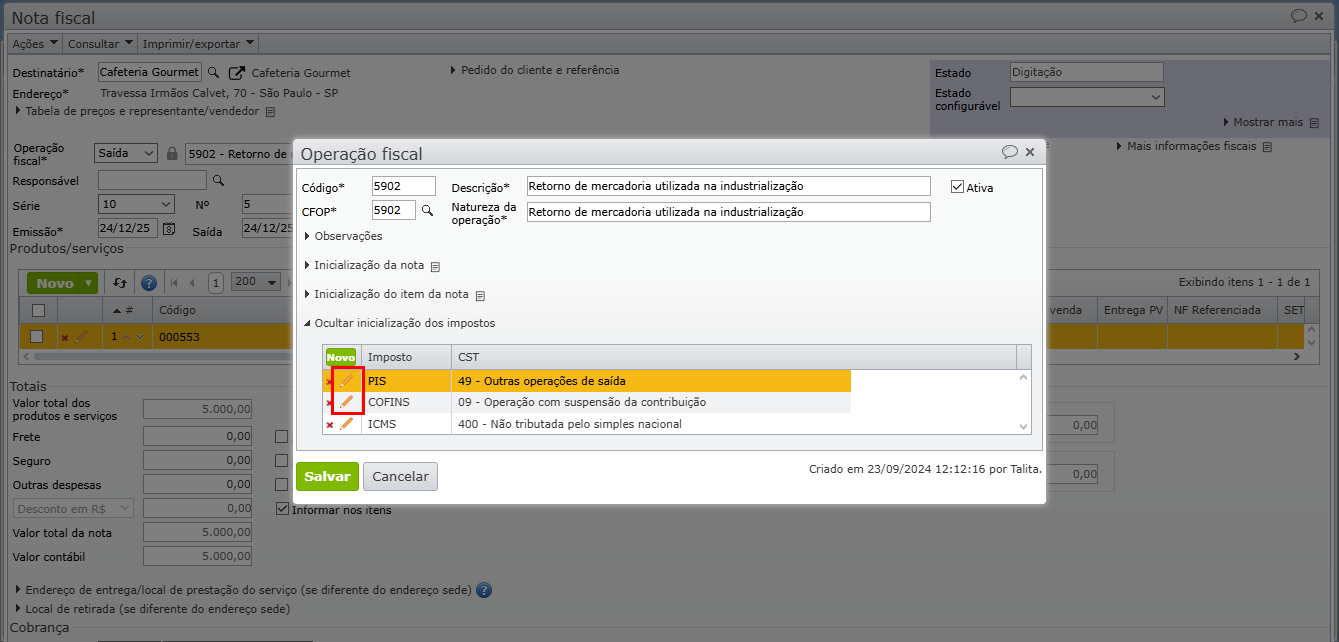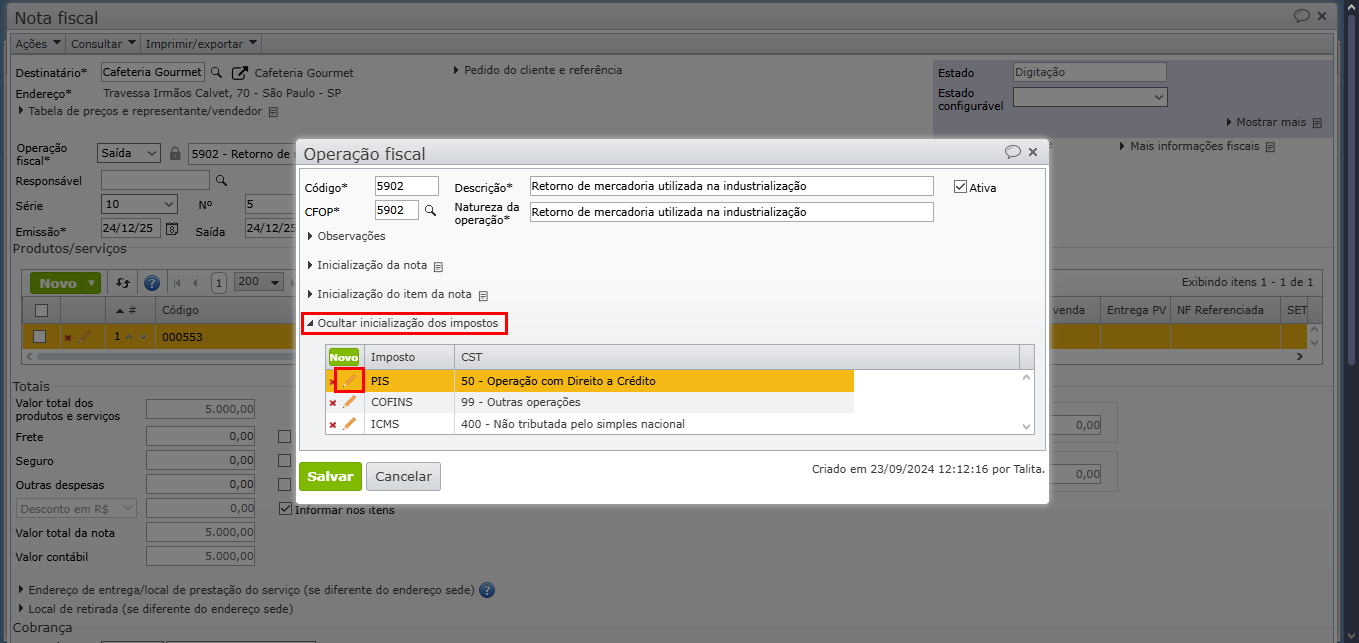 5) Na tela de edição da operação fiscal, expanda a seção “Inicialização dos impostos” e clique no ícone de lápis laranja ao lado do imposto PIS ou COFINS.