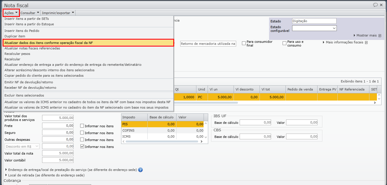 6) Atualize a nota conforme a operação fiscal pelo menu “Ações > Atualizar dados dos itens conforme operação fiscal da NF”. Para saber mais sobre operações fiscais, clique aqui.