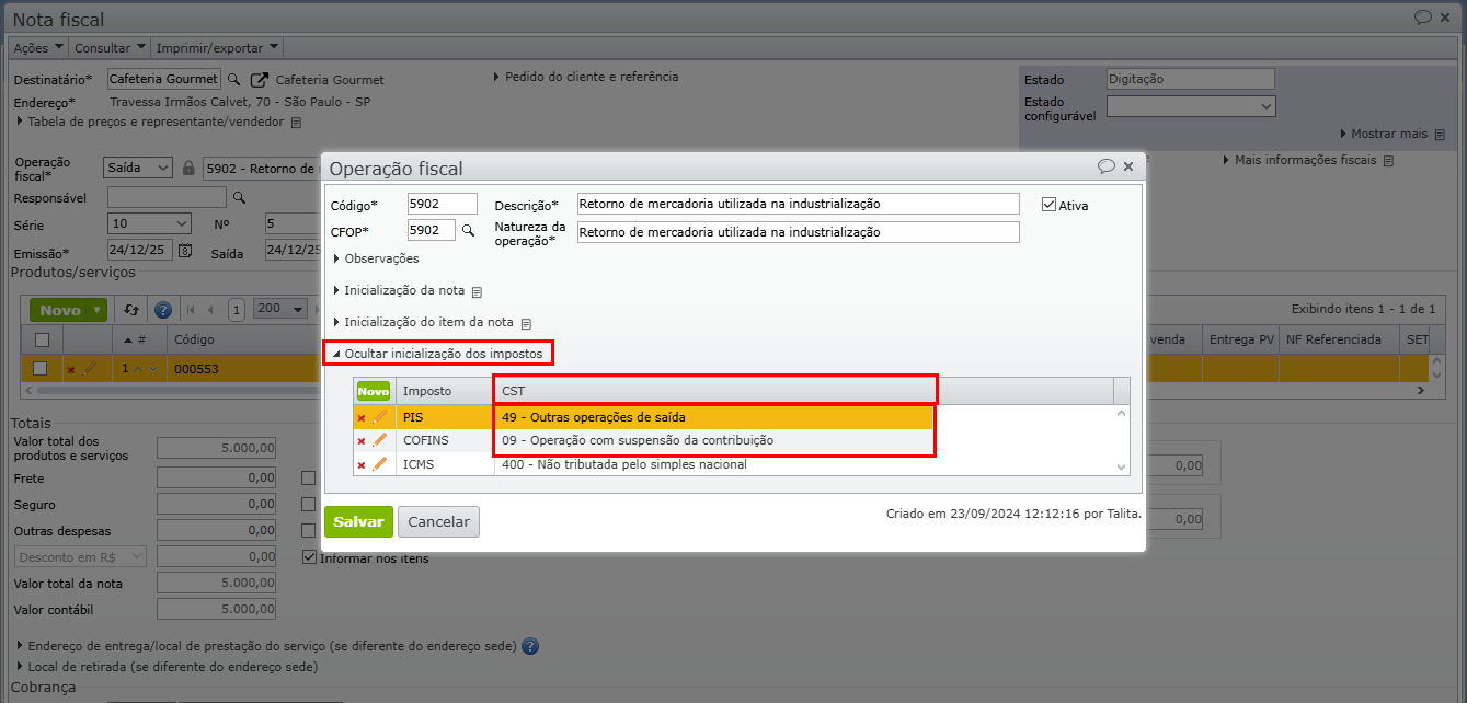 5) Na tela de edição da operação fiscal, expanda a seção “Inicialização dos impostos” e verifique a coluna “CST” indicada para PIS e COFINS.