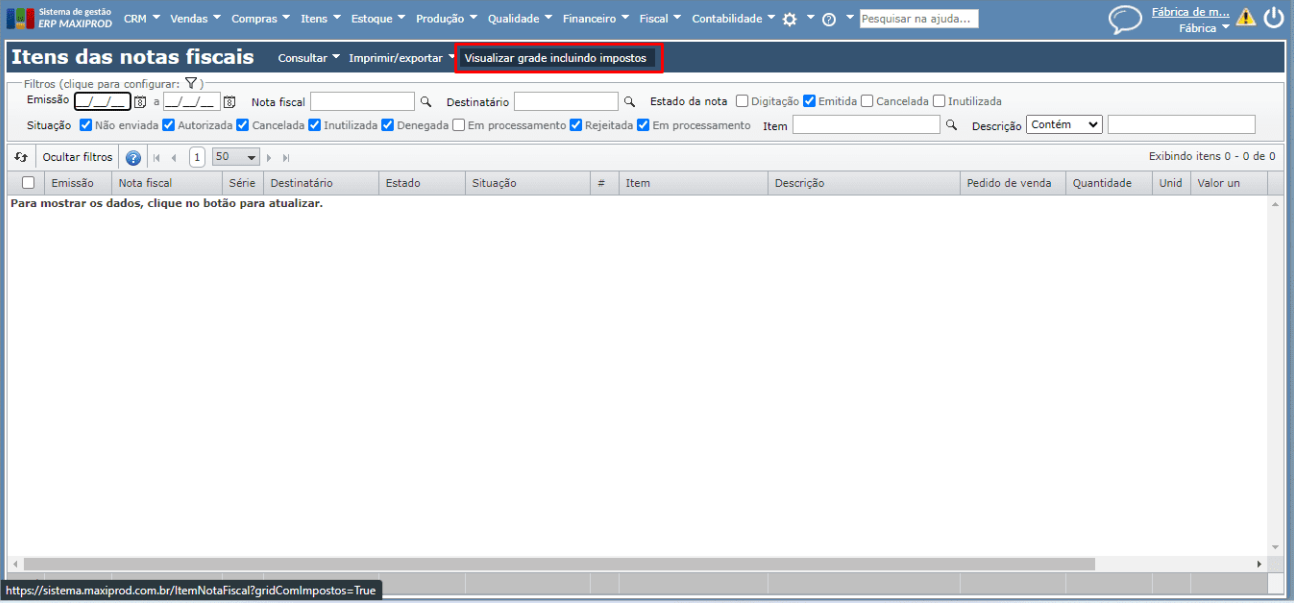 4) Nas telas “Itens das notas fiscais” ou “Itens das notas fiscais recebidas”, localize a opção “Visualizar grade incluindo impostos”. Clique nessa opção para habilitar os filtros e colunas referentes aos campos de impostos dos itens das notas.