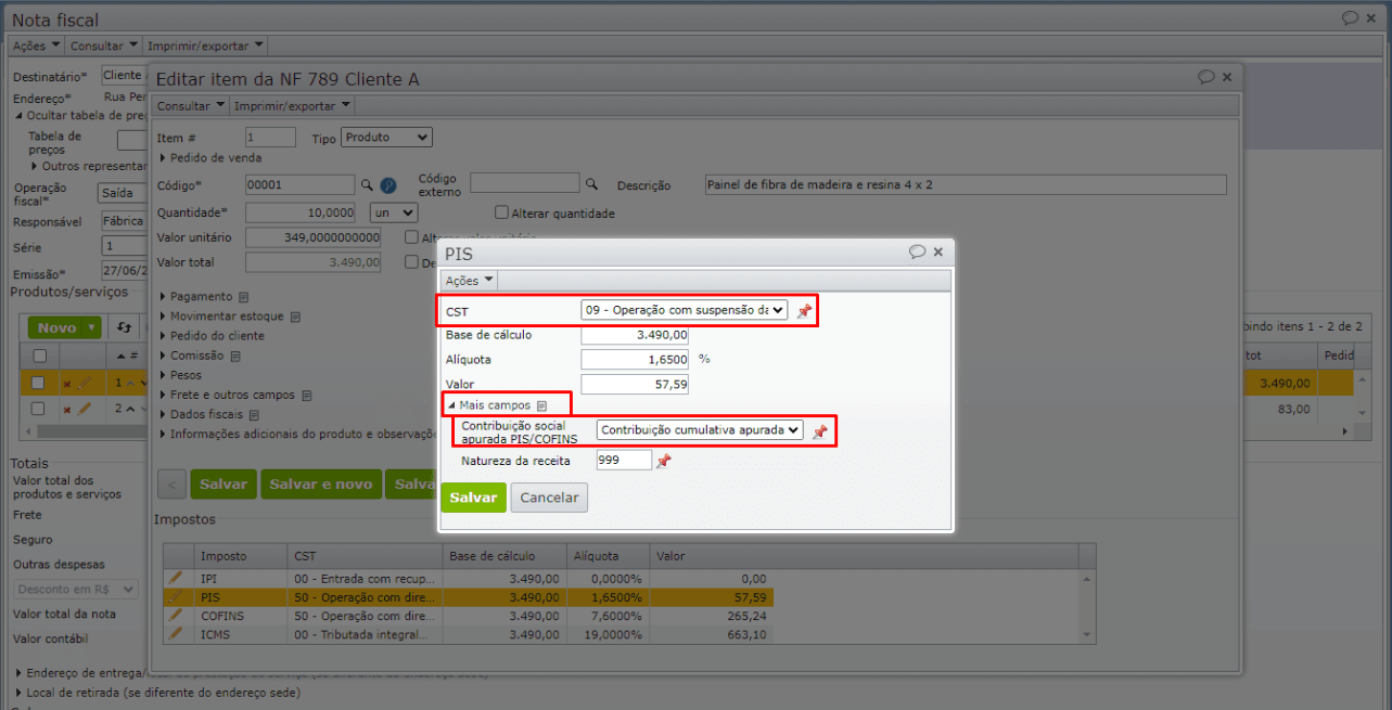 6) Faça a alteração clicando no ícone de lápis localizado ao lado dos impostos PIS e COFINS.