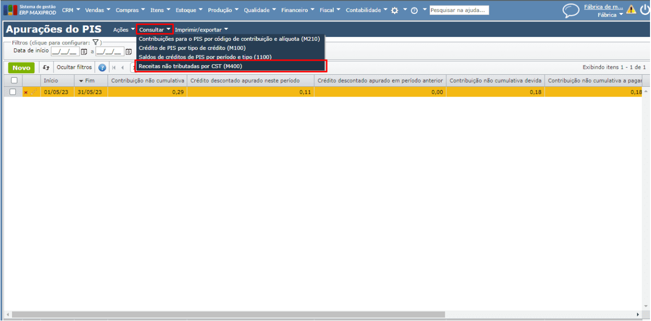 12) Para isso, acesse “Fiscal” > “Apurações” > “PIS ou COFINS”. Na tela de apuração, selecione a apuração do período e acesse “Consultar” > “Receitas não tributadas por CST (M400)”.