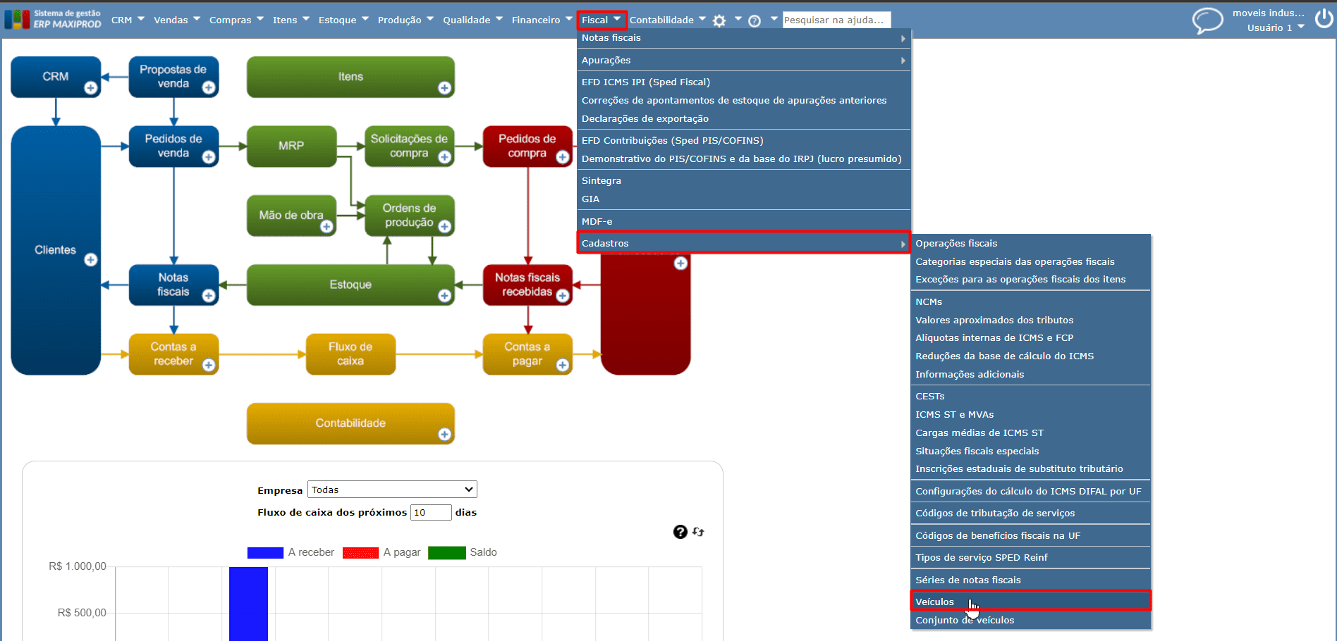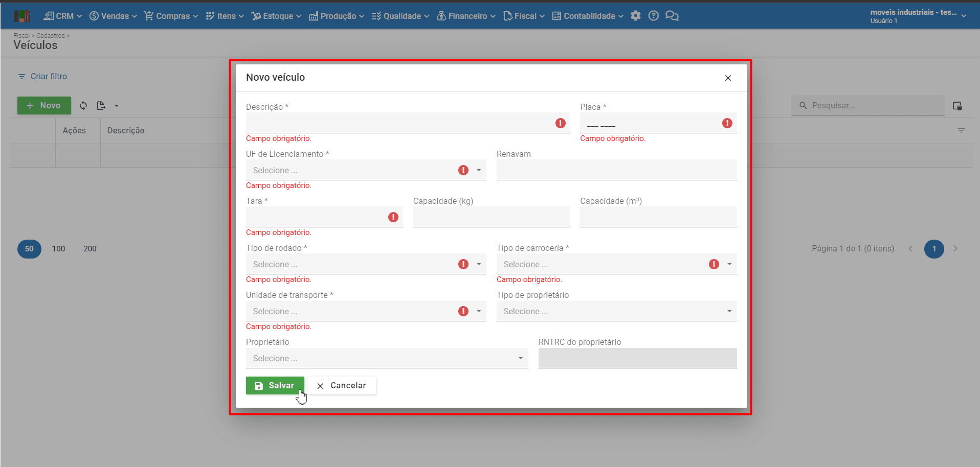 1) Para cadastrar um veículo, acesse o menu “Fiscal > Cadastros > Veículos”.