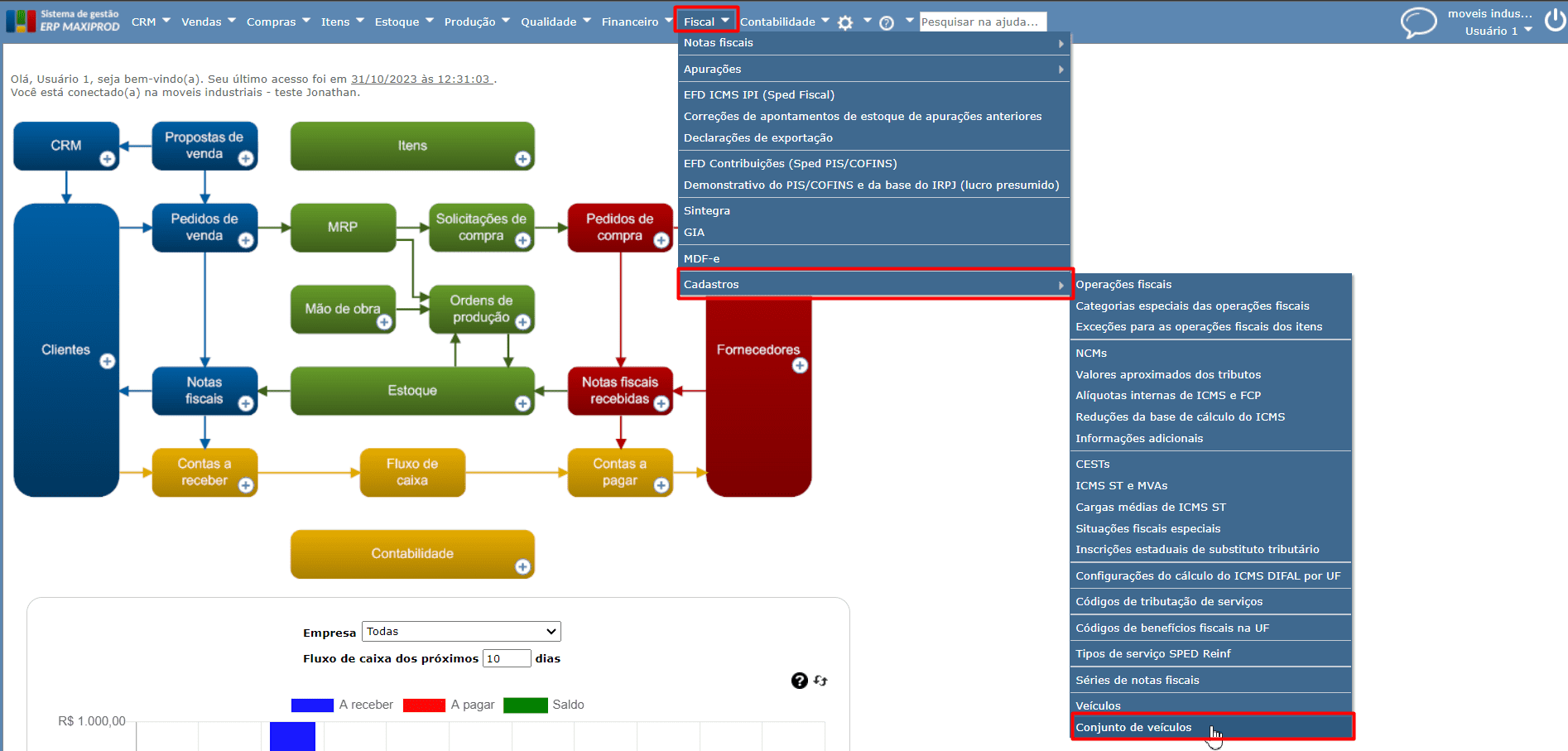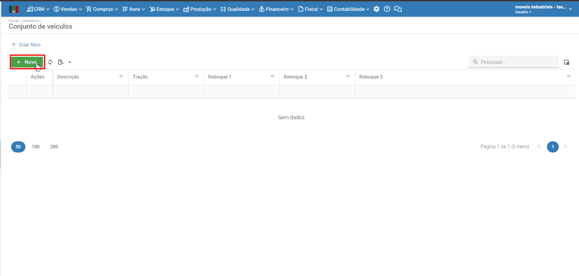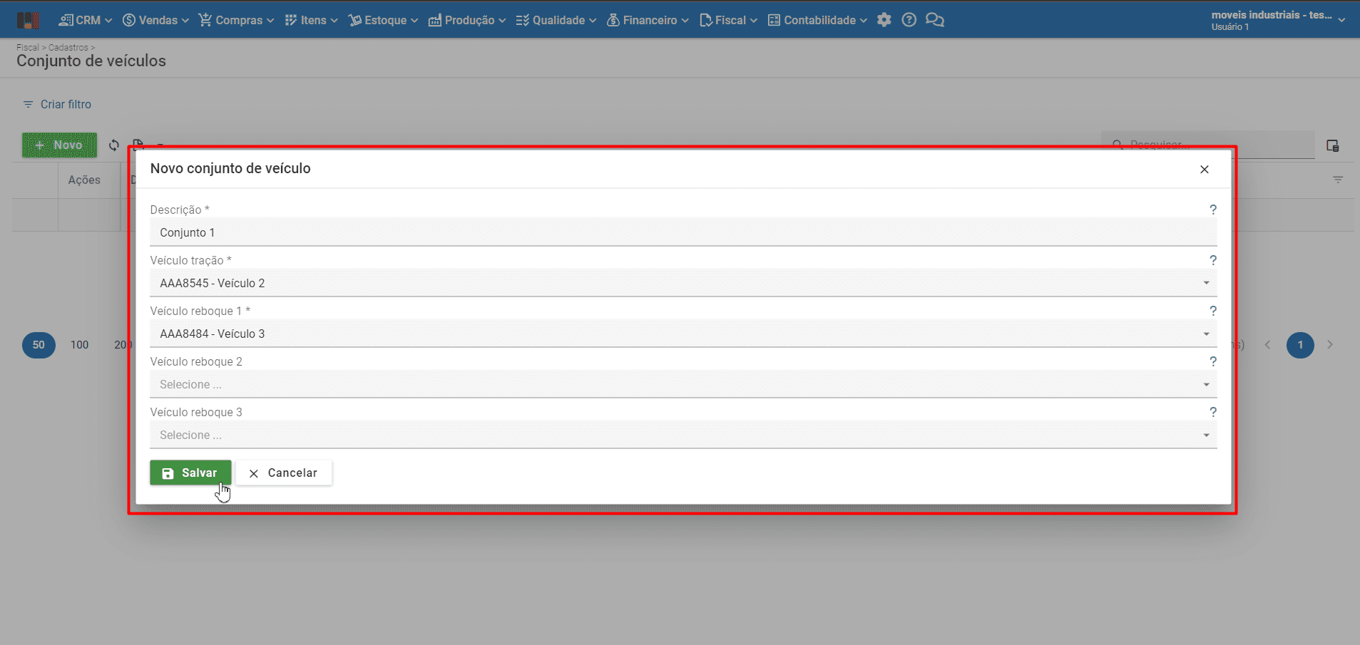 1) Acesse o menu “Fiscal > Cadastros > Conjunto de veículos”.