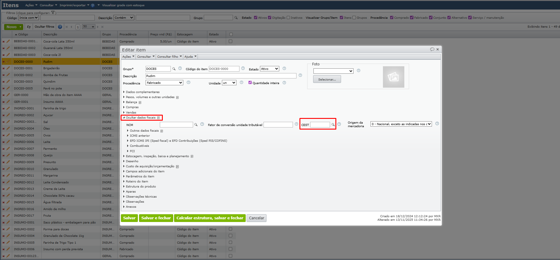 1) Para ter o ICMS ST, é obrigatório que o item tenha o CEST (Código Especificador da Substituição Tributária) informado em seu cadastro. Para configurar, acesse a tela “Itens > Itens”, edite o item, expanda a seção “Dados fiscais” e preencha o campo “CEST”.