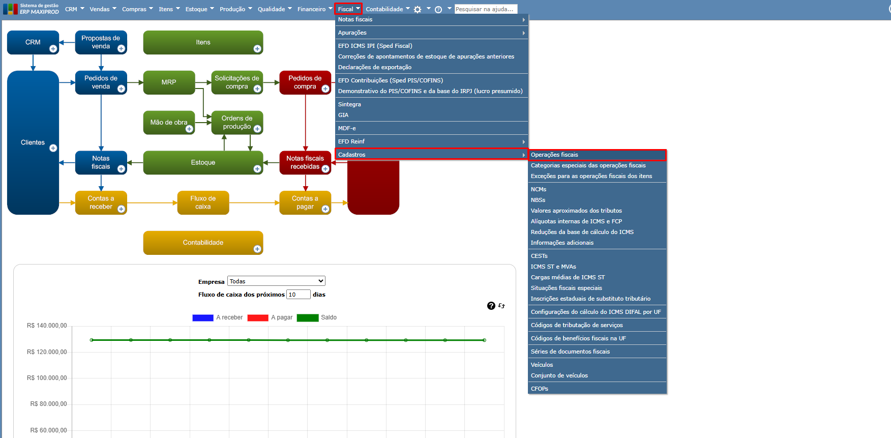 2) O sistema já possui um plano padrão de contas com operações fiscais com substituição tributária. No entanto, caso necessário, é possível inserir o imposto manualmente. Para configurar, acesse o menu “Fiscal > Cadastros > Operações fiscais” e clique no ícone de “lápis” para editar a operação fiscal desejada.