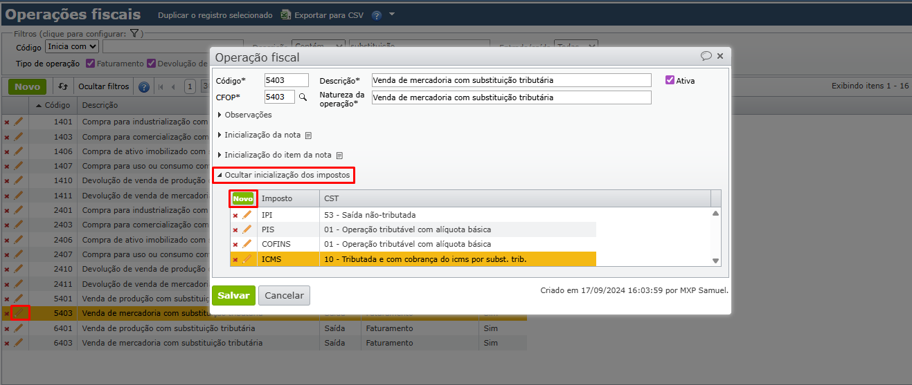 3) Na edição da operação fiscal, expanda a seção “Inicialização dos impostos” e clique no botão verde “Novo”.
