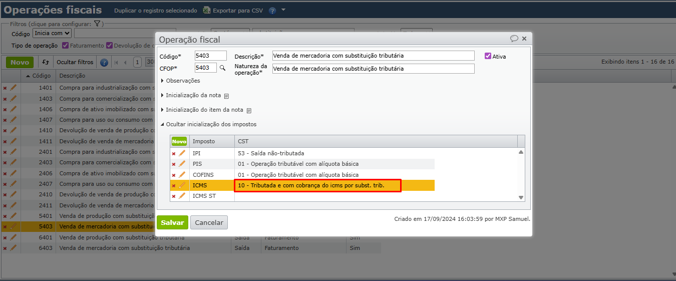 5) Certifique-se de que o CST (Código de Situação Tributária) do ICMS é adequado para o tipo de operação com substituição tributária. Para mais informações a respeito do cadastro de operações fiscais, clique aqui.