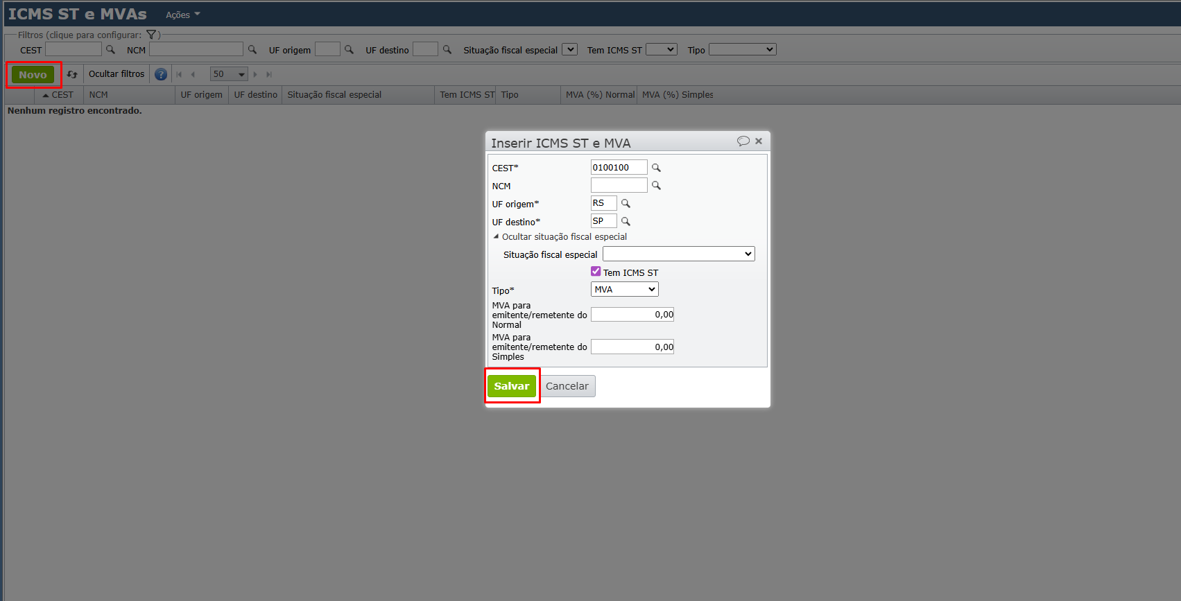 1) É possível, parametrizar o sistema, configurando alíquotas de MVA específicas por CEST e UF. Para isso, acesse o menu “Fiscal > Cadastros > ICMS ST e MVAs”.