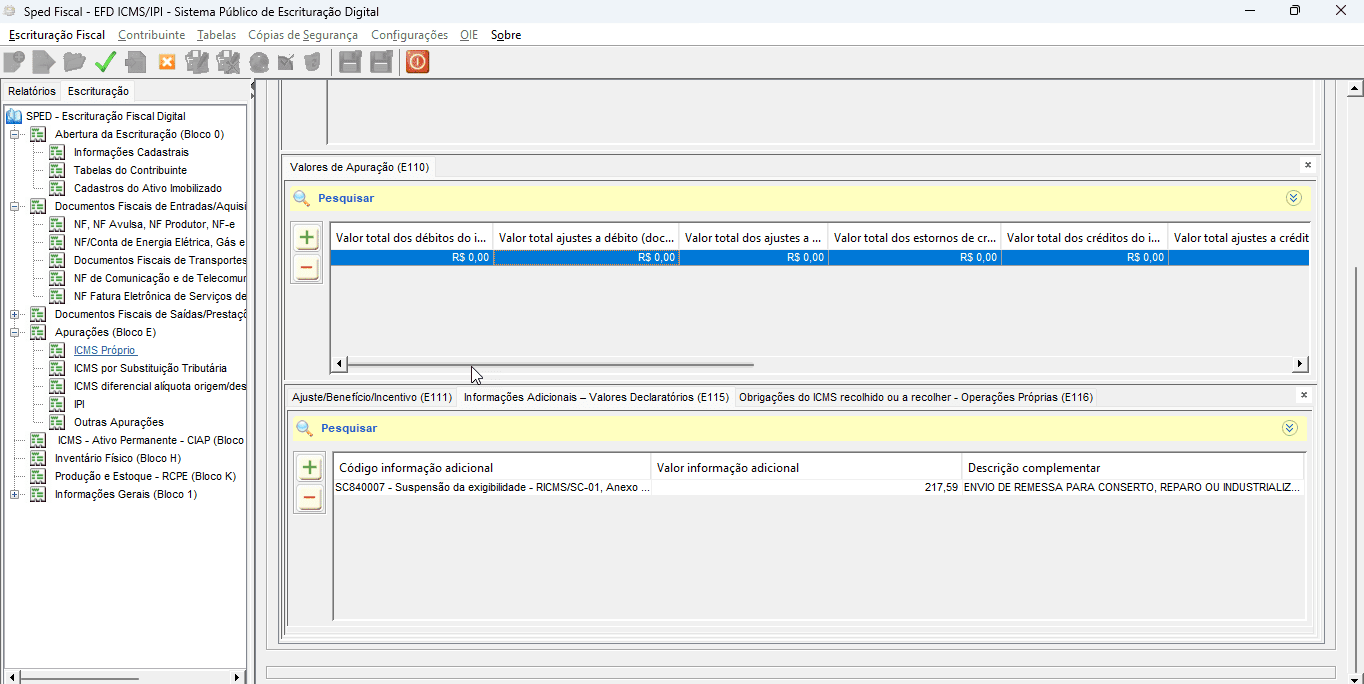 Ao gerar o SPED Fiscal (EFD ICMS/IPI) , se houver notas fiscais emitidas como a mencionada aqui, será gerado o registro E115- Informações adicionais da Apuração- Valores Declaratórios: