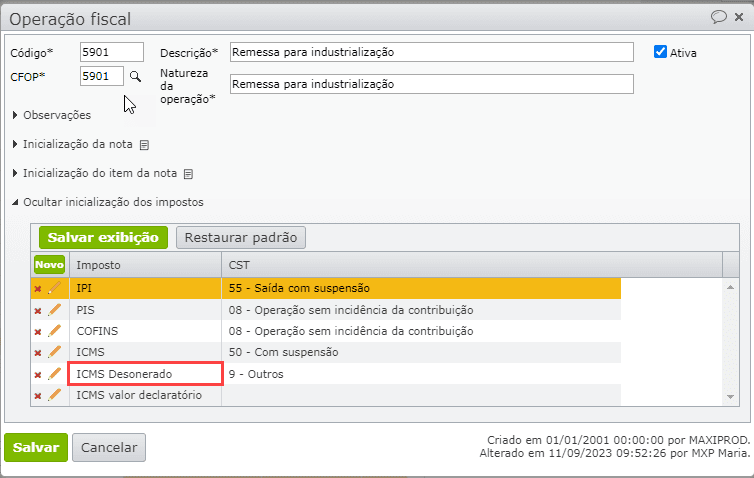 2) Na edição da operação fiscal desejada, clique em “Inicialização dos impostos”, campo “Novo”.