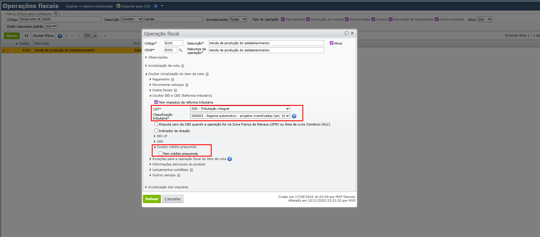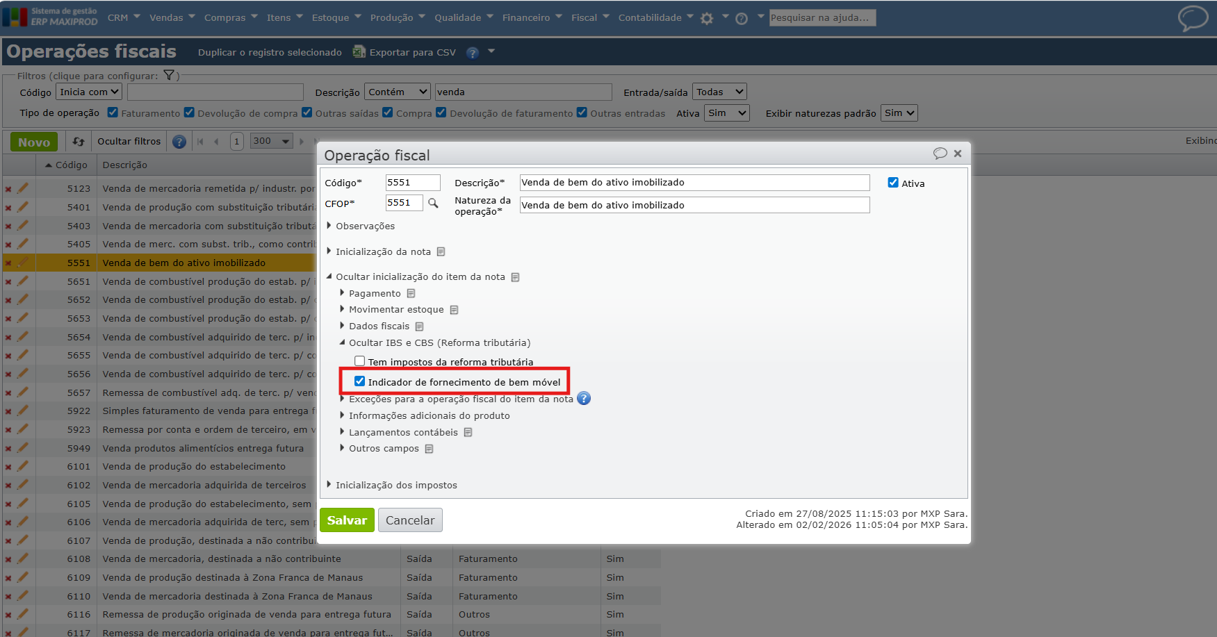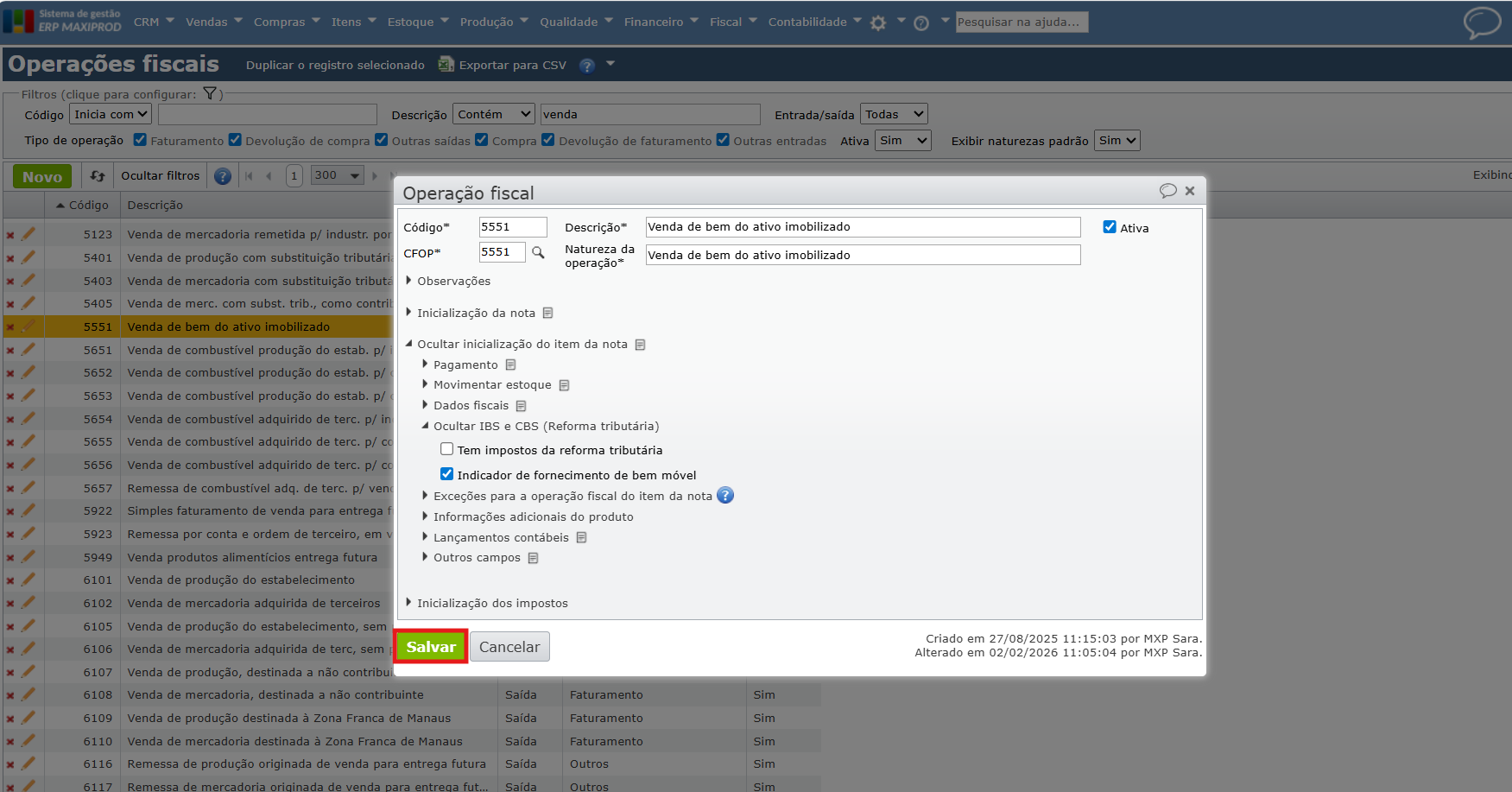 ⚠️ Importante: a definição da CST e da classificação tributária para IBS UF e CBS é de responsabilidade da empresa, em conjunto com sua contabilidade. O sistema valida automaticamente a compatibilidade entre CST e Classificação Tributária conforme as tabelas oficiais da SEFAZ. É recomendável fazer o levantamento das operações e tributações para 2026, garantindo que os documentos fiscais sejam preenchidos corretamente, tanto na edição da operação fiscal, como na emissão da nota fiscal.
