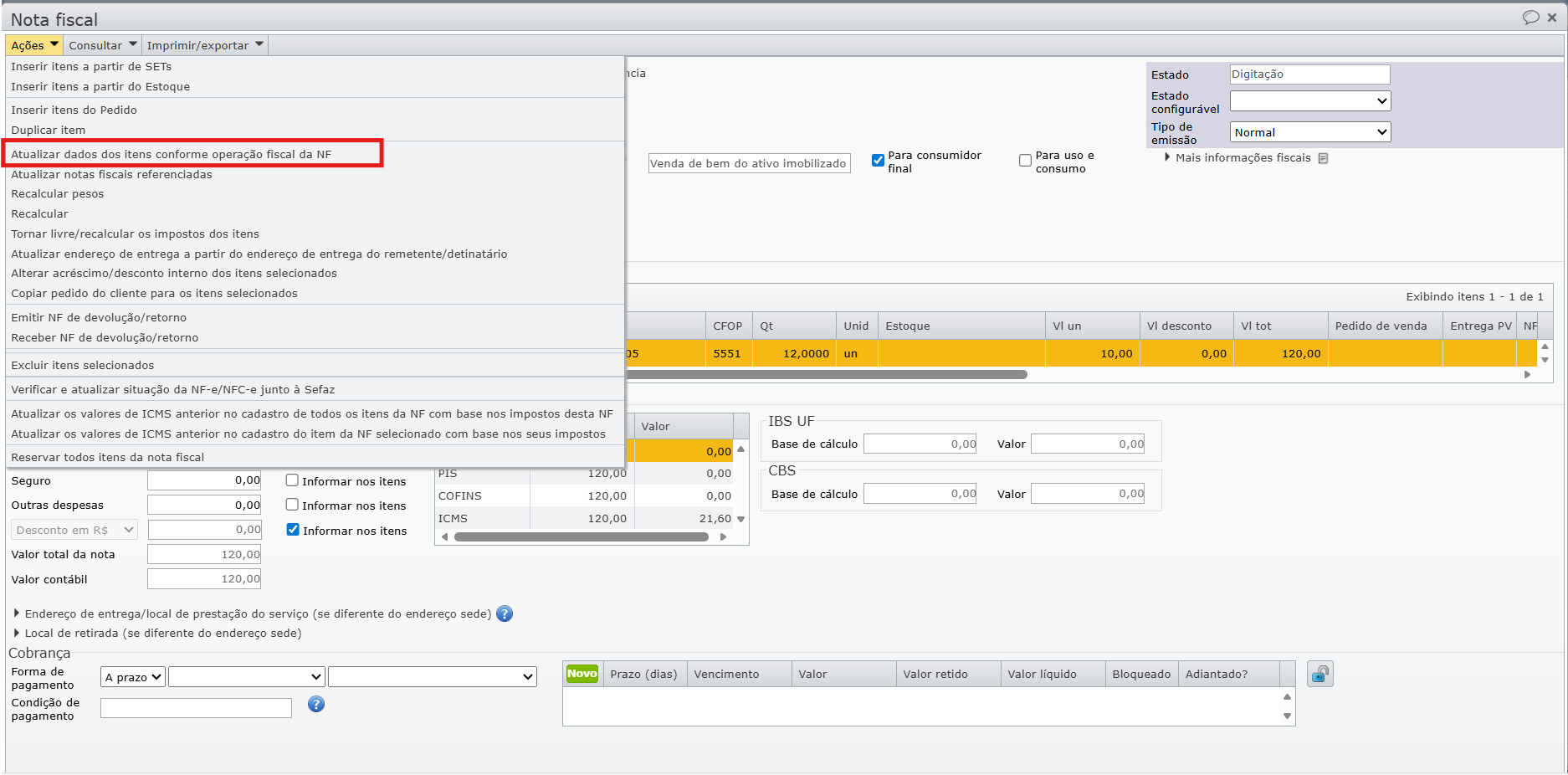 - Para atualizar notas já criadas: acesse “Ações > Atualizar dados dos itens da nota conforme operação fiscal”