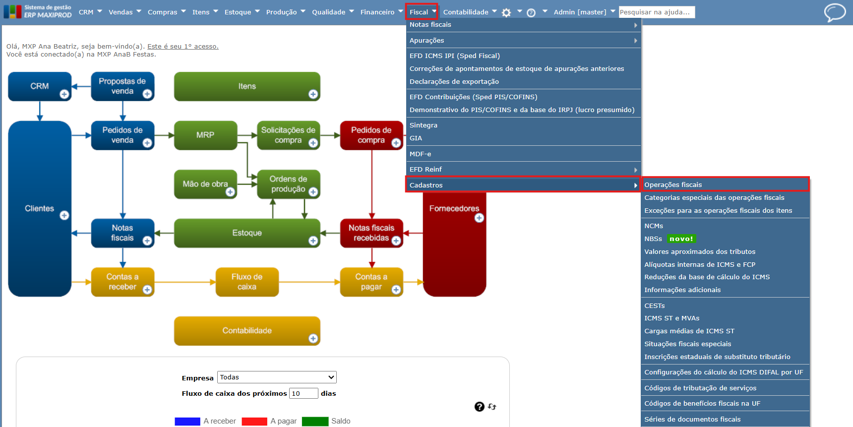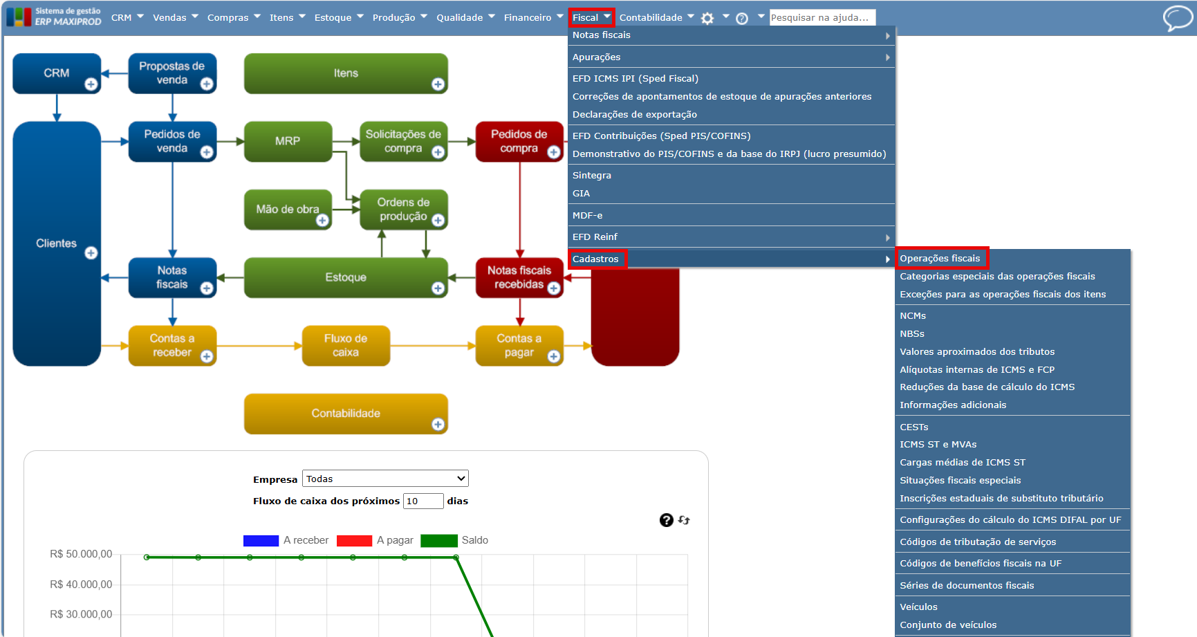 1) Acesse o menu “Fiscal > Cadastros > Operações Fiscais”.