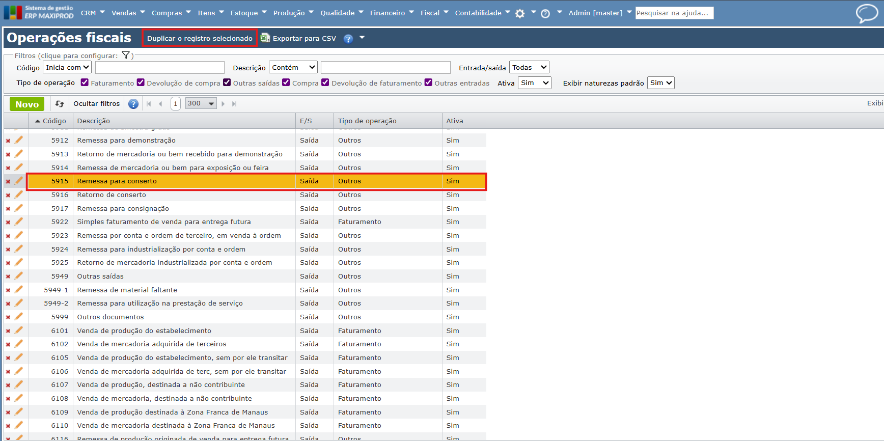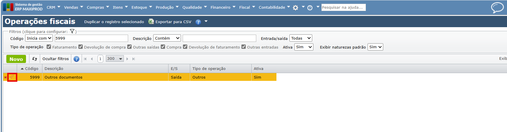 2) Selecione a operação fiscal, clique no ícone de lápis para editar ou duplique a operação para fazer alterações.