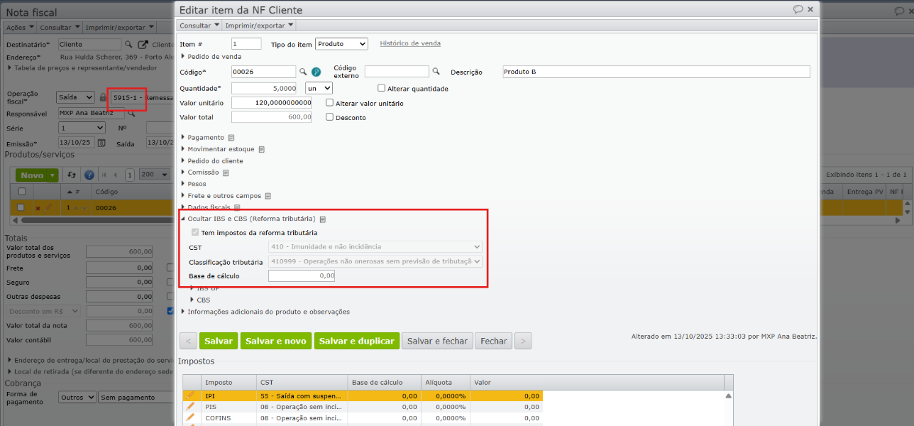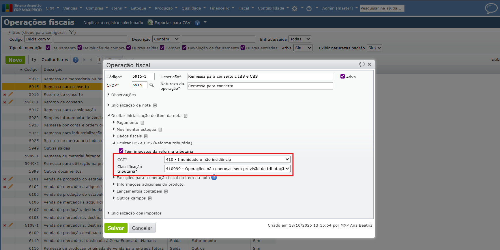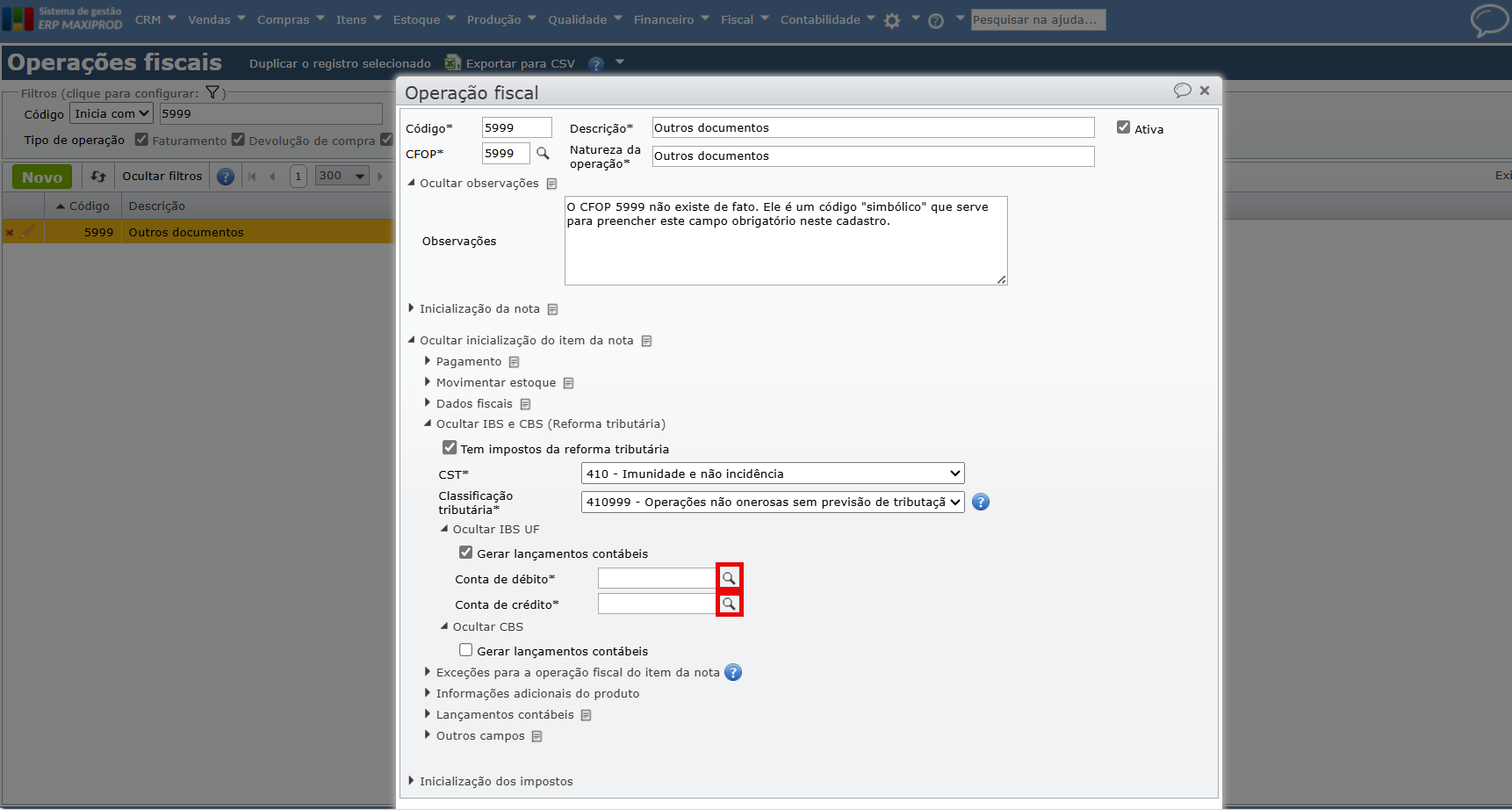 ⚠️ Importante: a definição da CST e da classificação tributária para IBS UF e CBS é de responsabilidade da empresa, em conjunto com sua contabilidade. É recomendável fazer o levantamento das operações e tributações para 2026, garantindo que os documentos fiscais sejam preenchidos corretamente, tanto na edição da operação fiscal, quanto na emissão da nota fiscal.
