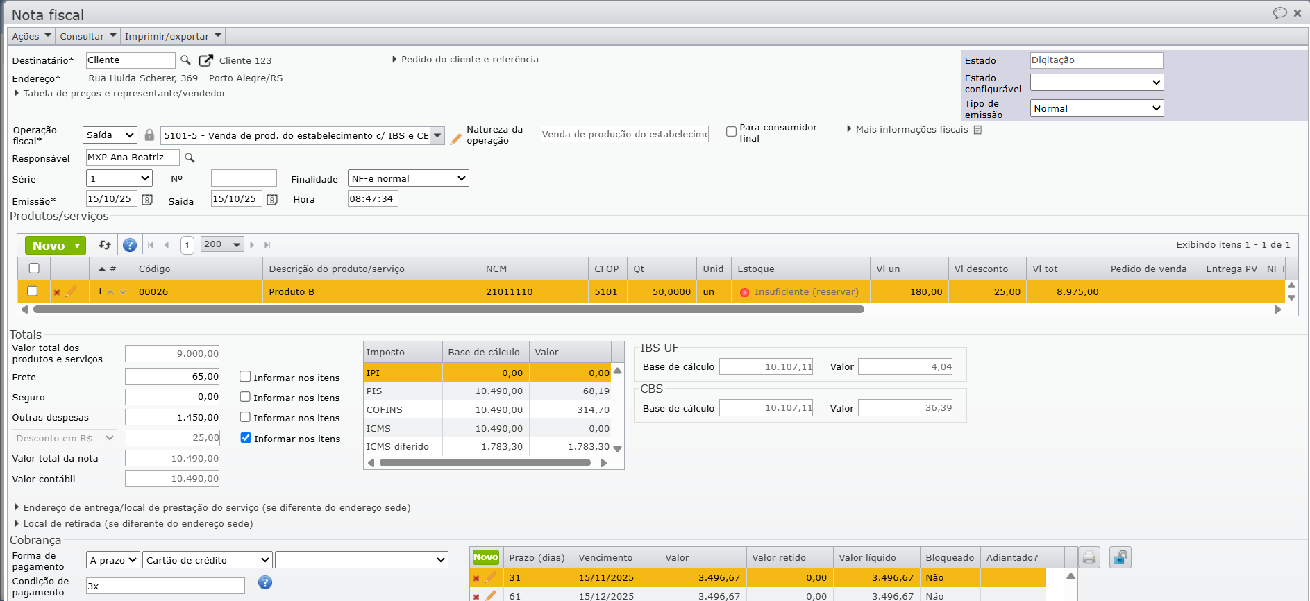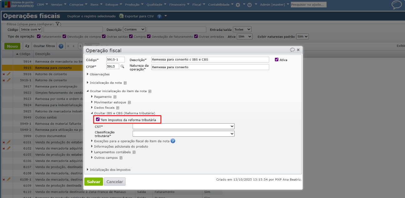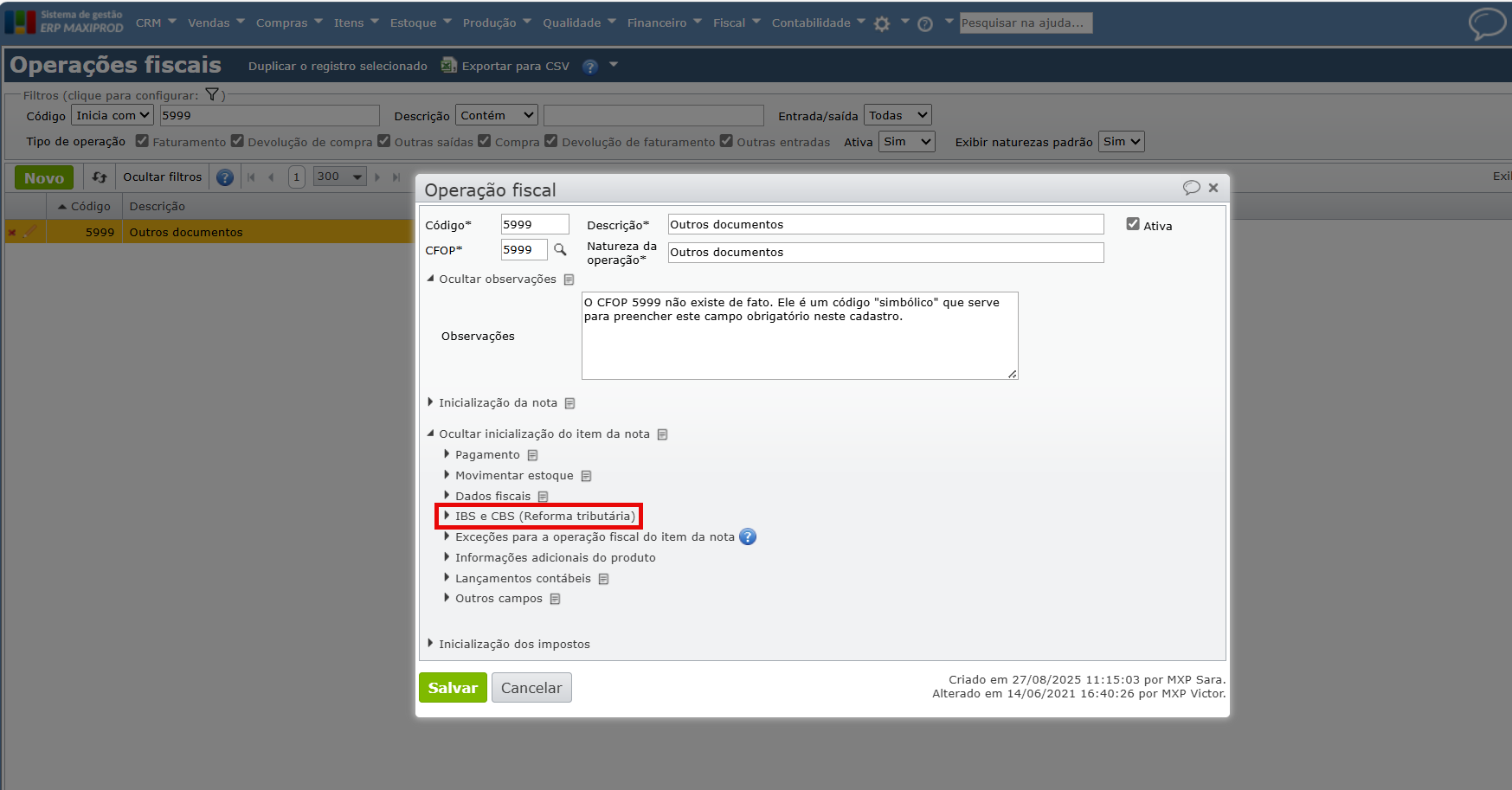 ⚠️ Importante: a definição da CST e da classificação tributária para IBS UF e CBS é de responsabilidade da empresa, em conjunto com sua contabilidade. É recomendável fazer o levantamento das operações e tributações para 2026, garantindo que os documentos fiscais sejam preenchidos corretamente, tanto na edição da operação fiscal, quanto na emissão da nota fiscal.
