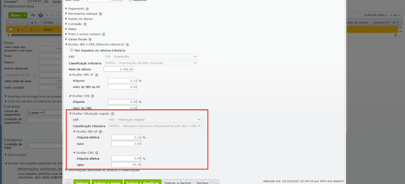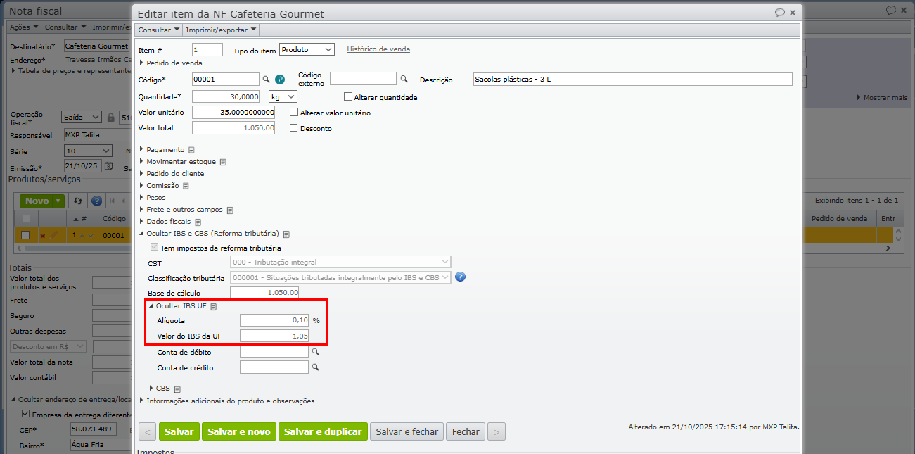 - Valor do IBS da UF: calculado automaticamente com base na alíquota e base de cálculo