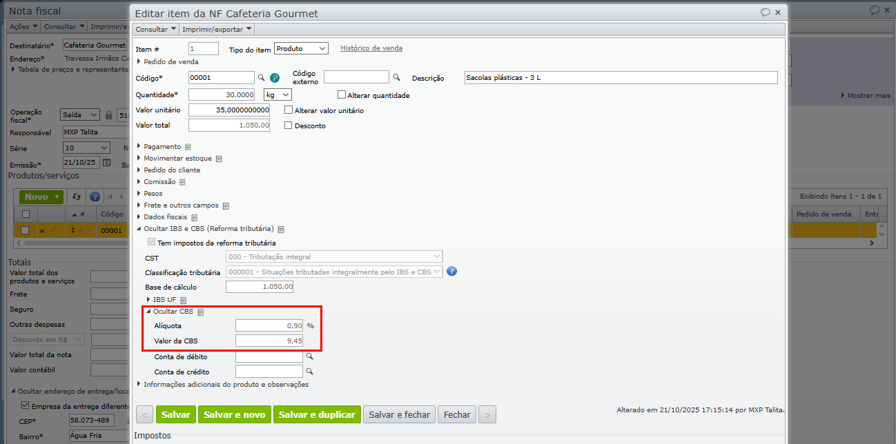 - Valor da CBS: calculado automaticamente com base na alíquota e base de cálculo