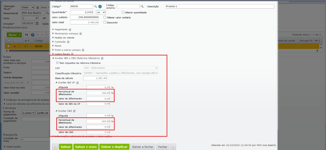 O diferimento é aplicado em situações previstas na Lei Complementar 214/2025, permitindo adiar o pagamento do imposto para uma etapa posterior da cadeia de produção ou comercial. Ao selecionar a CST “510 – Diferimento”, o sistema exibe os campos de diferimento automaticamente, sendo eles: